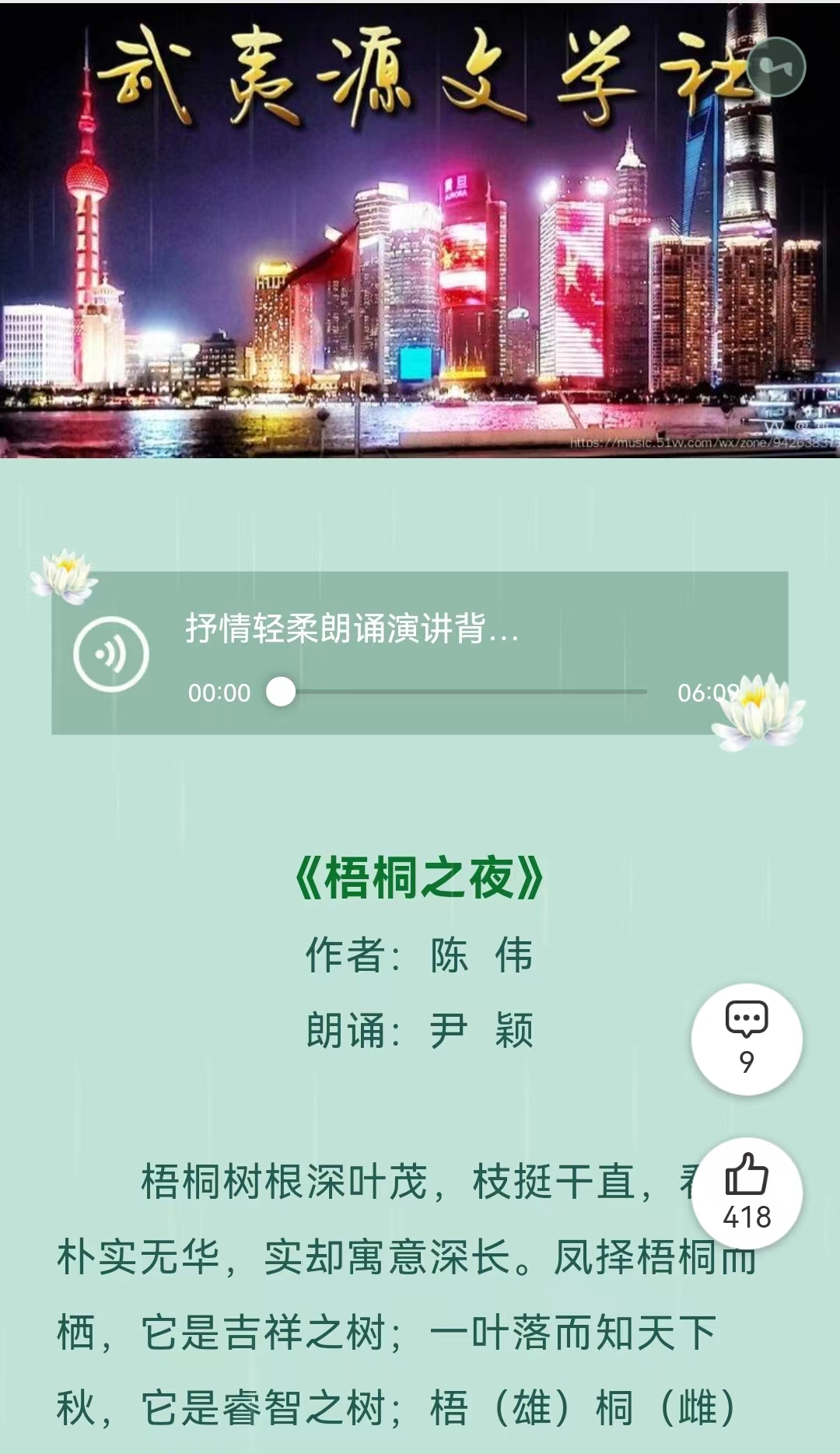 文学社成立至今,已在“VV音乐”平台上发布5篇,平均阅读量4000,居住在小区的居民可以发布自己的所感所想,也可以发布自己的书法、绘画、摄影、视频等作品,还有多名朗诵协会的会员、公园管理者等进行配音朗诵,图文并茂、丰富多彩,既像是多媒体展示的小报,也像是一台小型的文艺汇演。