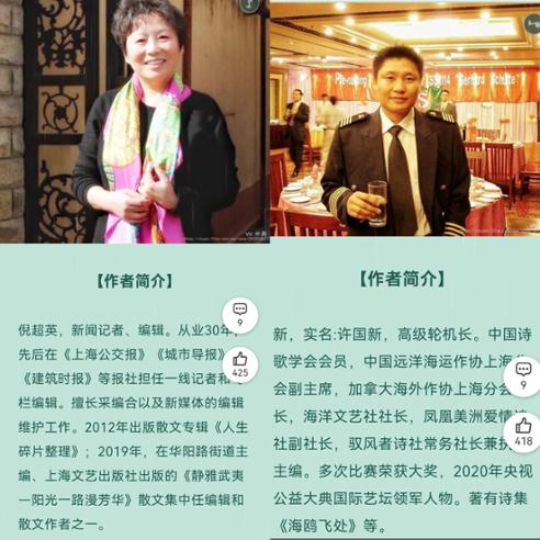 倪超英本人就是元朝大诗人、画家倪瓒的后人。“小区的居民有1000多,本身就有编剧、导演、作家等文化界人士生活在这里。”倪超英介绍,高级轮机长许国新常年漂泊在海上,虽是一名海员,但也很喜欢文学,是中国诗歌学会会员、中国远洋海运作协上海分会副主席、海洋文艺社社长,著有《海鸥飞处》等诗集作品,“我们当时就商量,是不是再发起成立一个文学社。”