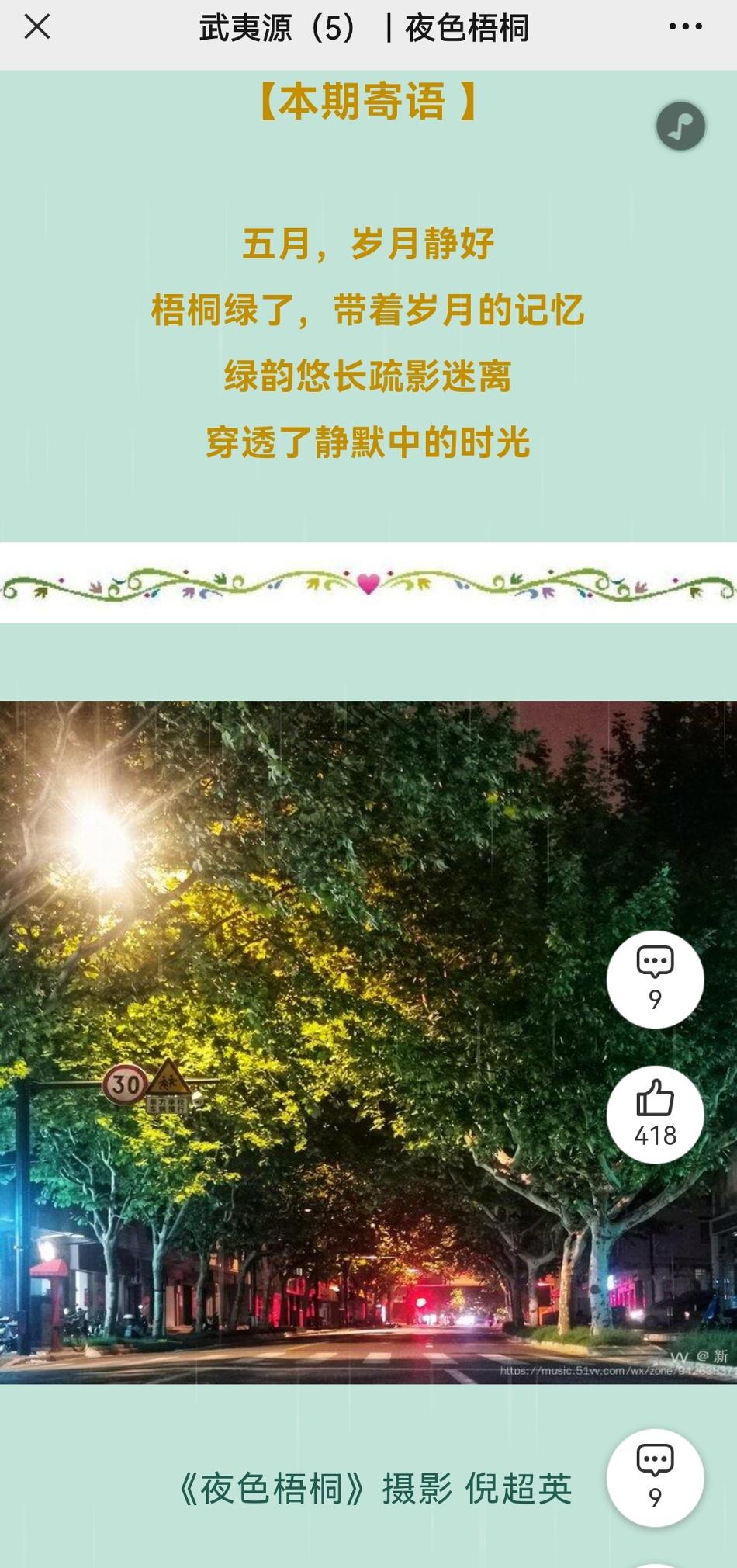 文学社5月5日成立,倪超英先是拿出来原本闲置的个人公众号——“花漾径”,改名为“武夷源文学社”。同时考虑到编辑的便捷性和视频图片文字的多样性,除了公众号推送以外,以更多的节奏在“VV音乐”平台上发布。