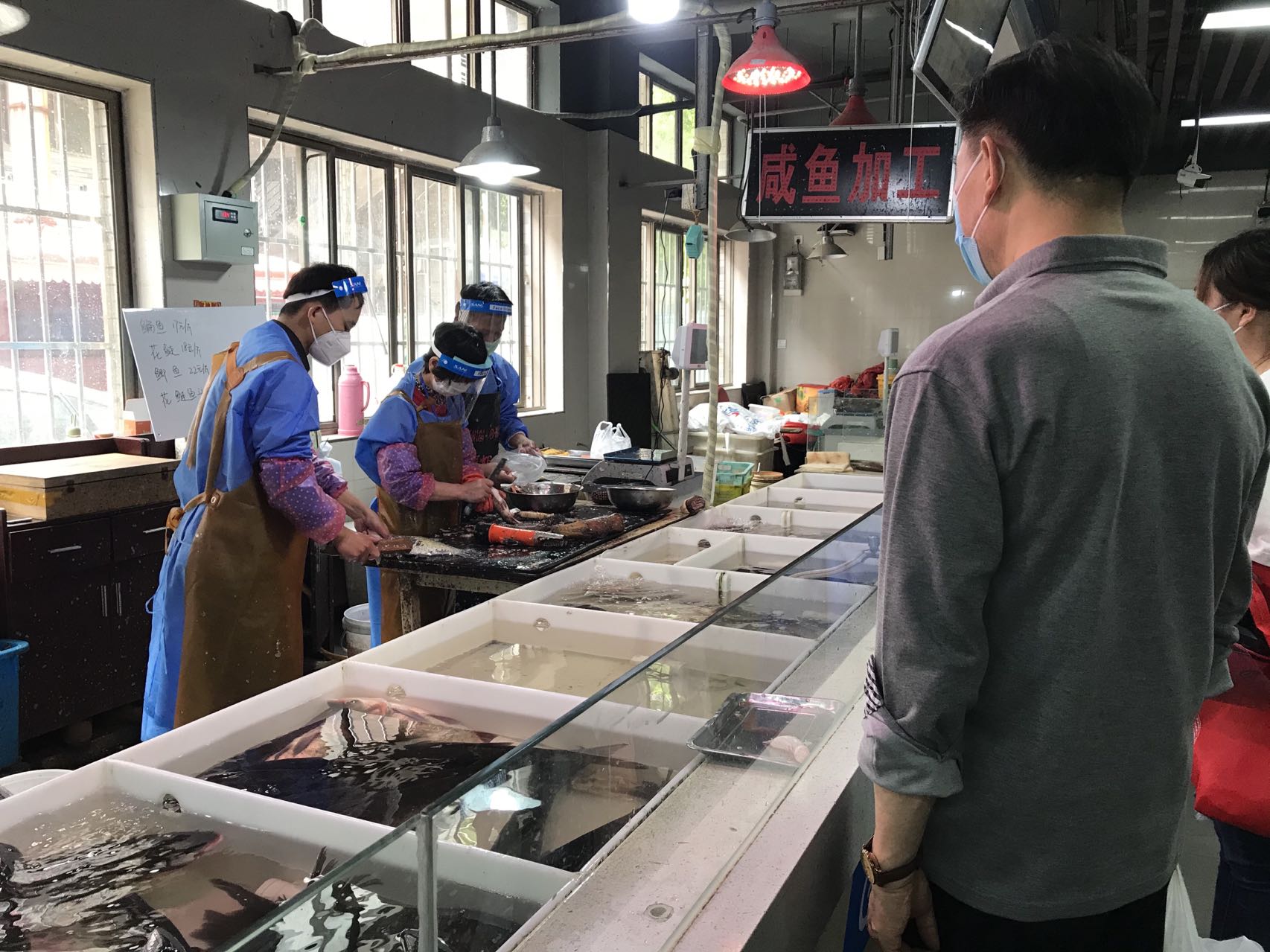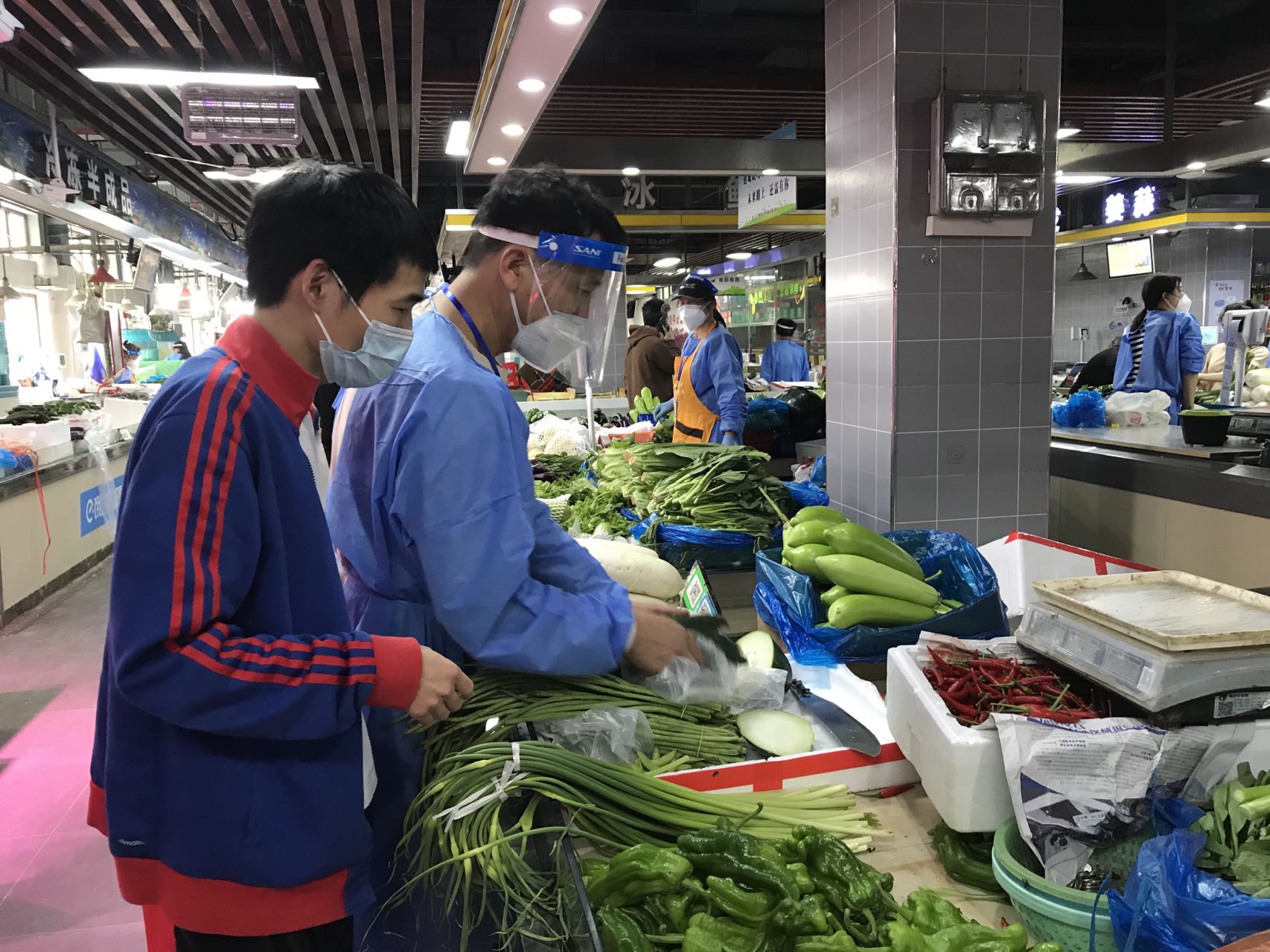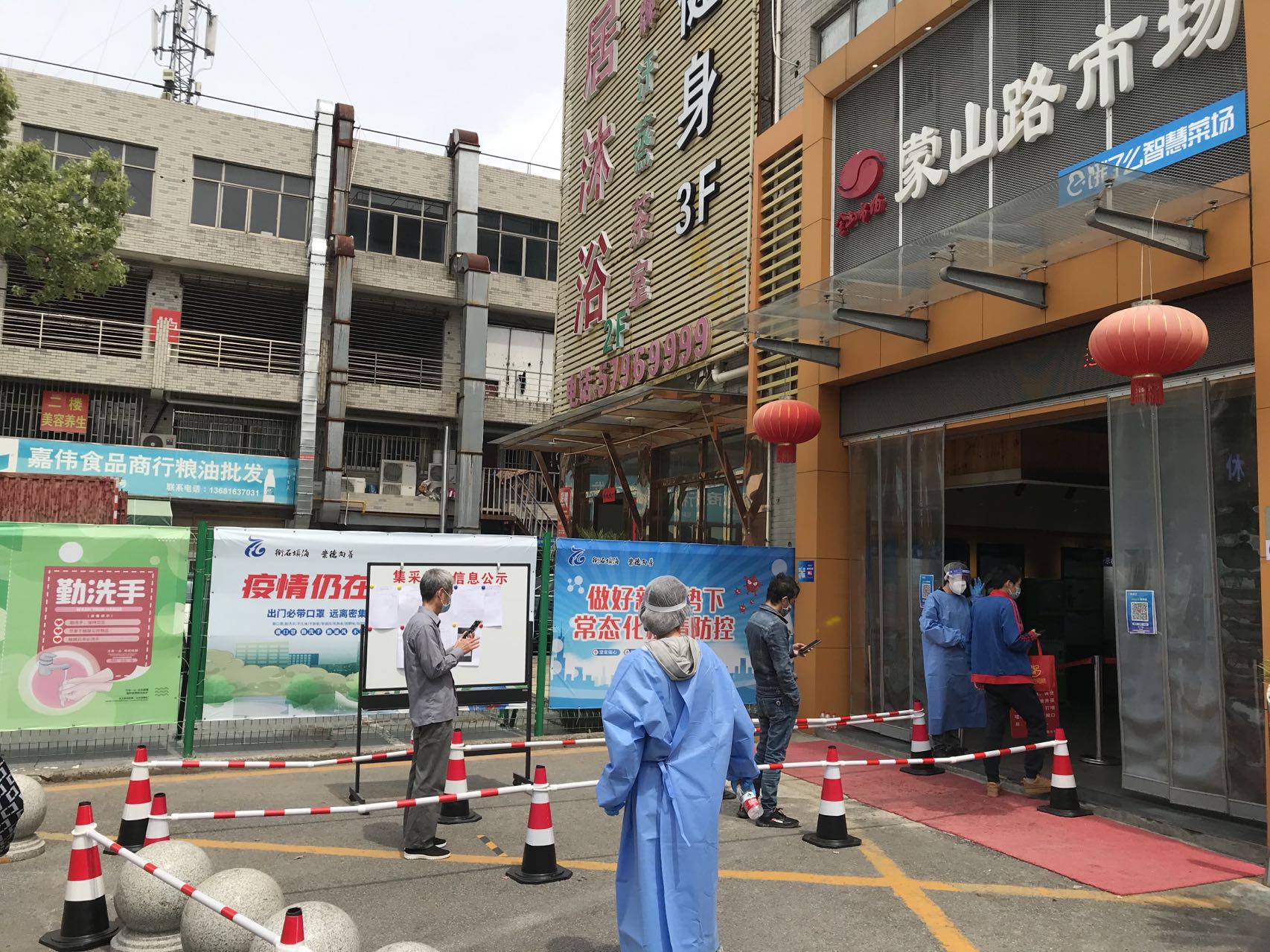 到了菜场第一道门,同样要出示石化街道的出门证,才能更近一步。于是先前的场景再次演绎了一遍,继续顺利前行。