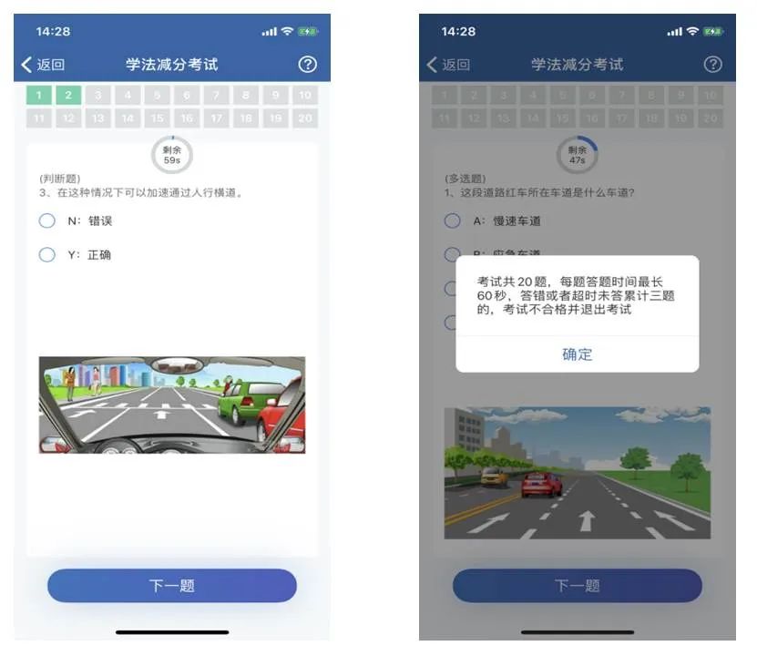 9、确认个人信息后,系统随机抽取20道试题,每题限时答题时间60秒,如在倒计时内未完成答题,则系统判断为该题目未答,答错或者超时未答累计三题的考试不合格,右上角问号按钮弹框提示用户考试规则。