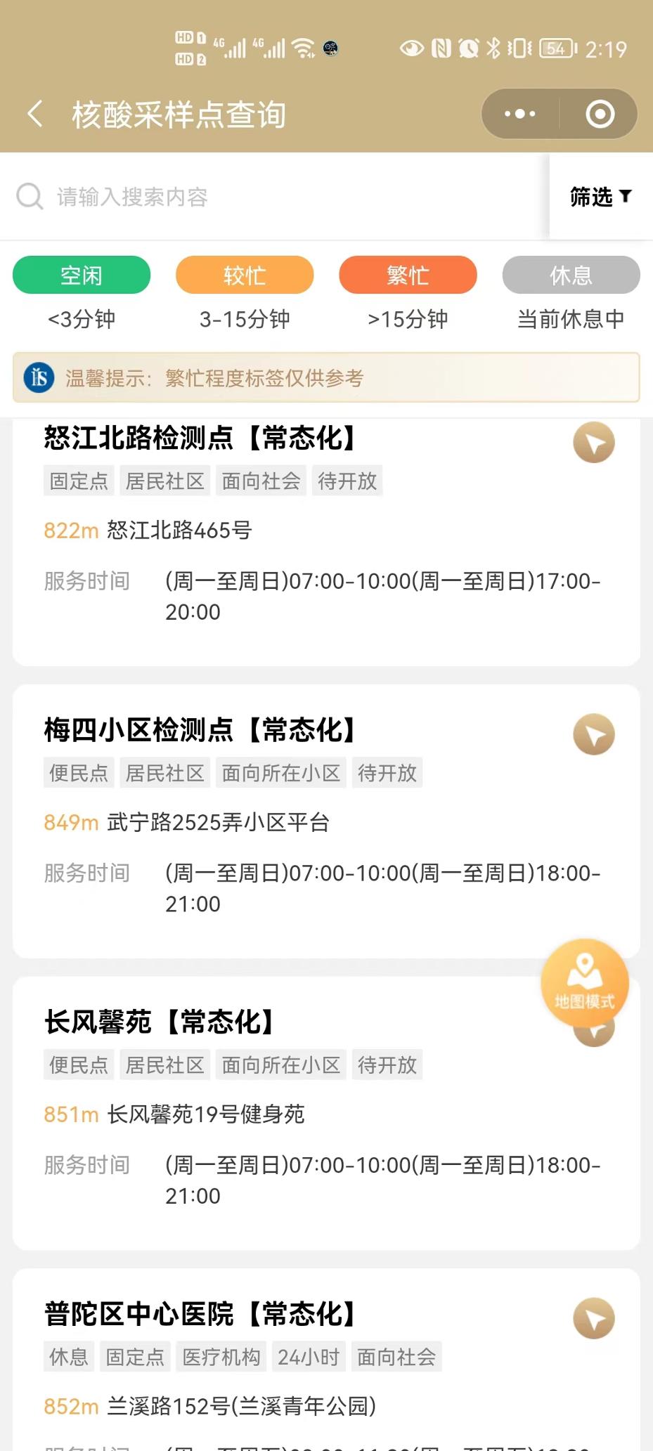 首先,市民可以通过随申办APP,支付宝、微信随申办小程序进入“核酸采样点”查询系统,查询点位地址、类型、服务时间、忙闲状态等,并可进入电子地图模式进行位置导航。