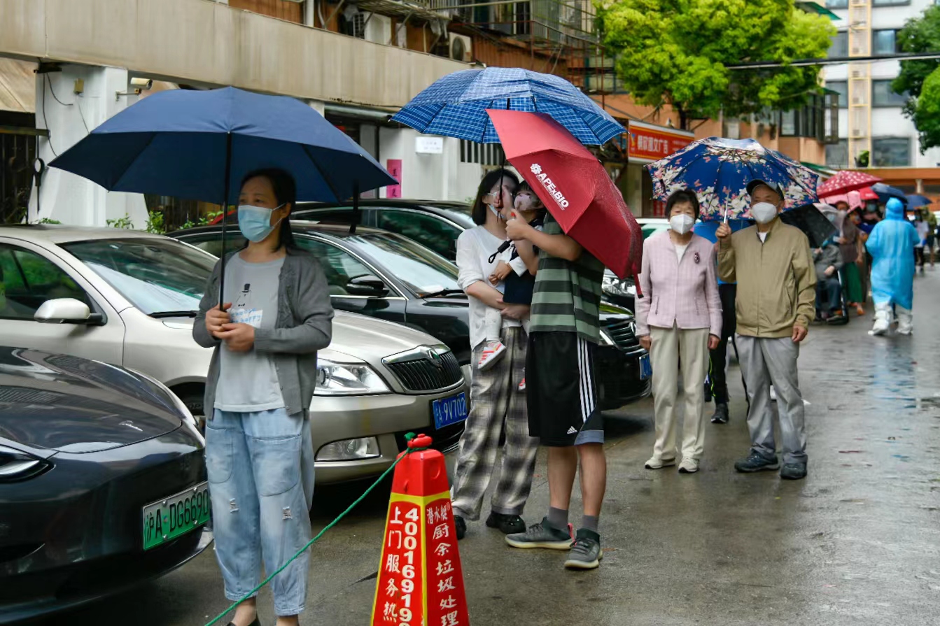 今日也正式入梅。核酸到一半,雨说下就下。居民打着伞,也不忘间隔排队等候