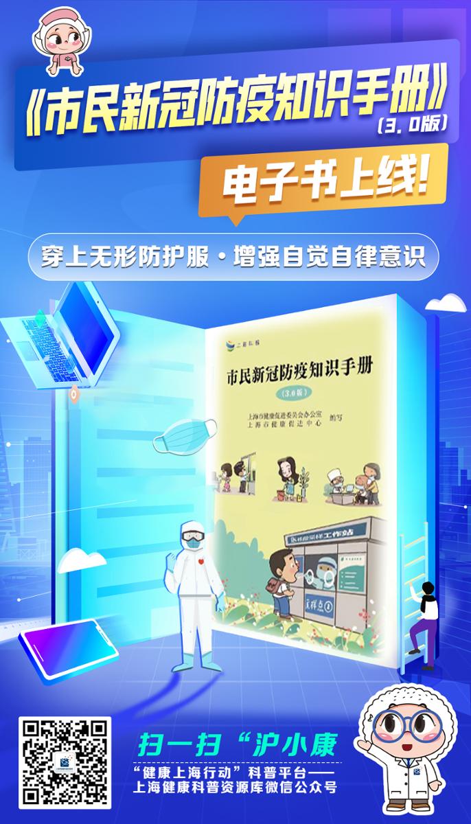 当下社会生产生活正在有序恢复,做好常态化疫情防控,降新增、防反弹,离不开每一位市民的自觉自律。为持续提升市民自我防护意识与能力,在市科委专项的支持下,市健康促进委员会办公室、市健康促进中心团队又推出《市民新冠防疫知识手册》(3.0版),包括新冠防控知识的120个问答,有声书同步推出,6月17日正式在“健康上海行动”科普平台——上海健康科普资源库(“沪小康”)微信公众号上线啦。