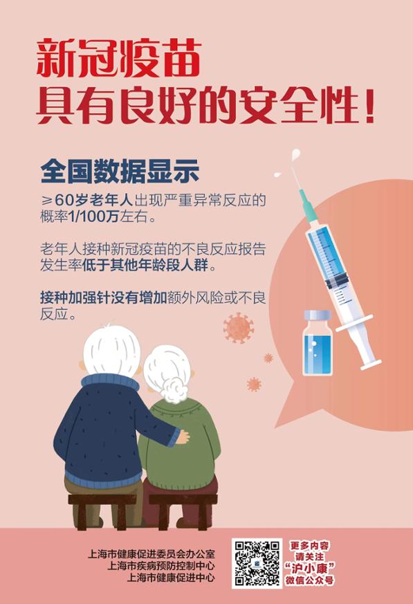新冠疫苗具有良好的安全性!全国数据显示,60岁及以上老年人出现严重异常反应的概率是百万分之一左右,老年人接种新冠疫苗的不良反应报告发生率低于其他年龄段人群。接种加强针没有增加额外风险或不良反应。