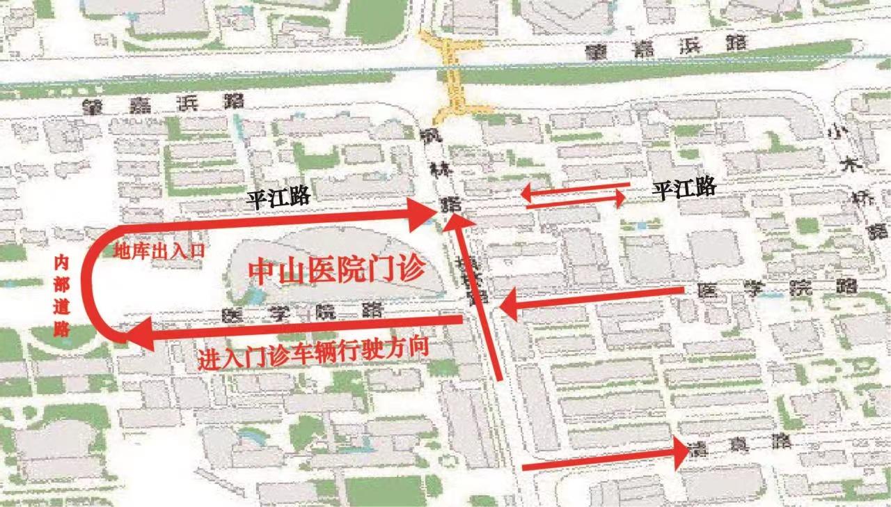 而在医学院路上的门诊出入口,门诊出入地库车辆与送医车辆均从枫林路驶入医学院路,进入医院内部道路,再至平江路驶出,回到枫林路,形成一个U型微循环(如图)。在门诊高峰时段,因门诊入口临时上下客频繁、地库车辆出入等原因,该循环通行速度缓慢,易造成枫林路平江路口拥堵,继而影响枫林路车辆通行。