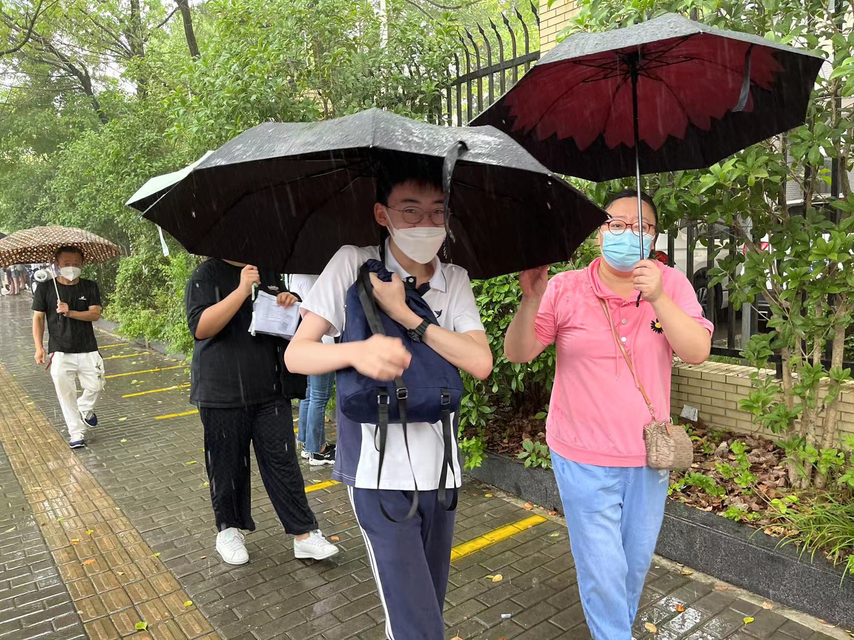 八点钟左右,考点突然下起了大暴雨,老师们纷纷撑开伞,然而伞都不约而同的朝着考生头上遮去。“衣服别湿了,外套先放书包里。”“到了考场要把头发、身上擦干,别在空调下面吹。”一边帮考生背好书包,老师一边嘱咐着。