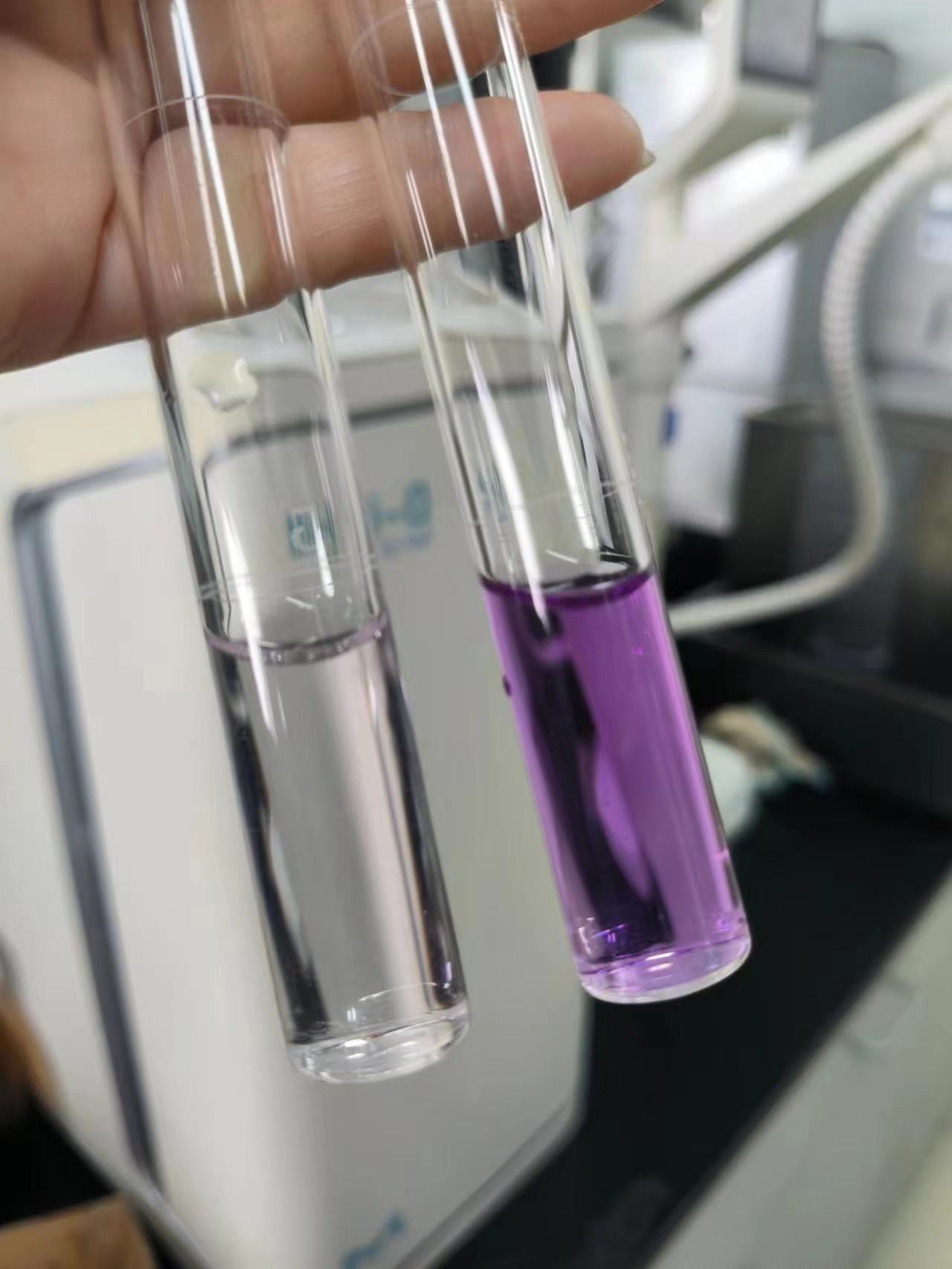 张晓波说,在实验环节,会使用到一些“工具”和仪器。比如,测试甲醛会用到紫外分光光度计,对空气中的甲醛含量进行定量显色的分析,通过最终的吸收液颜色深浅变化来量化室内的甲醛浓度。