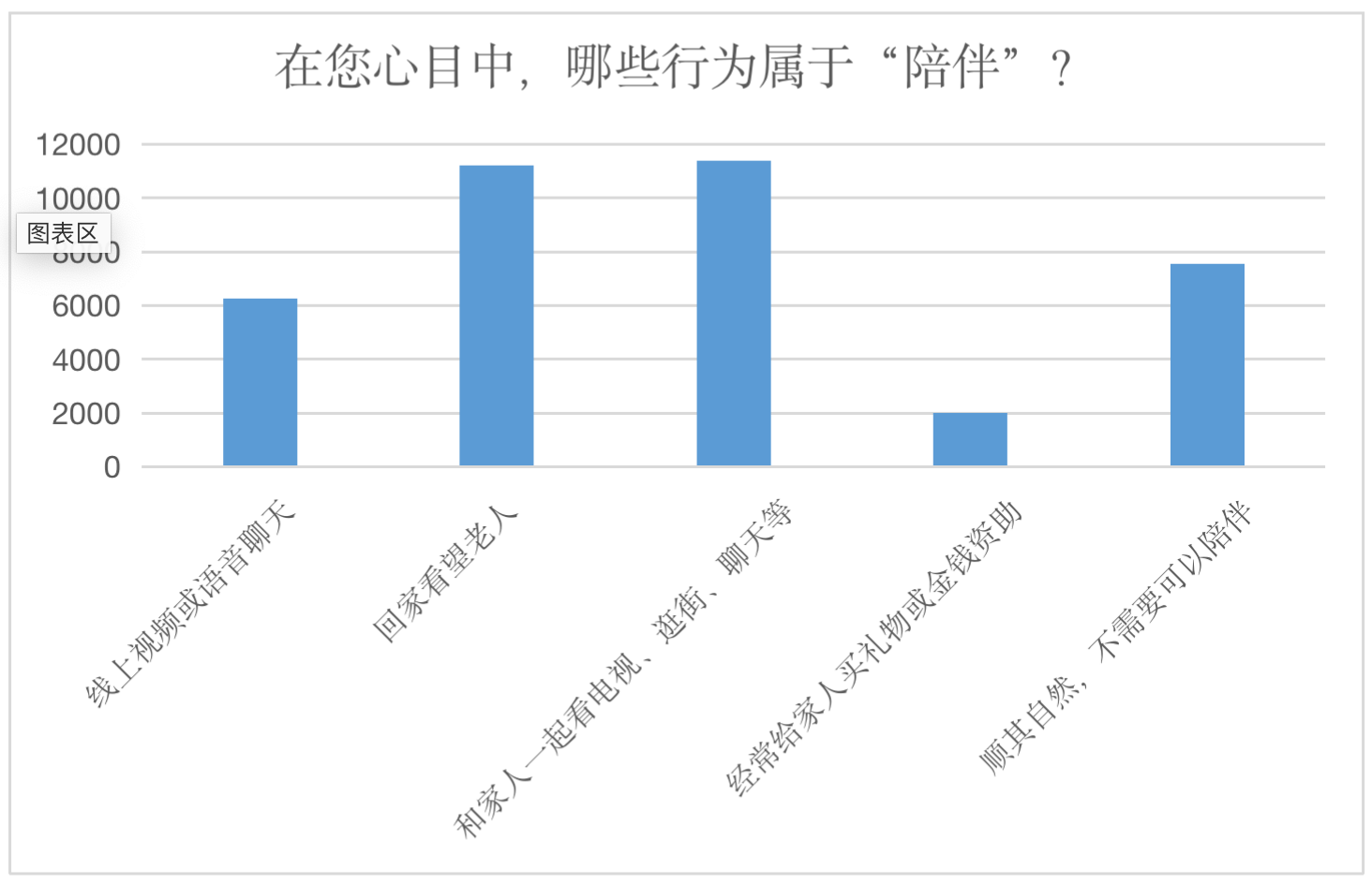 在劳动报的中秋调查问卷中,有11229位受访者认为“子女常回家看看老人”是最好的陪伴,占比52%;11372位受访者认为“和家人一起看电视、吃饭、逛街”就是陪伴。由此可见,在更多人心中,面对面聚在一起的行为是最令人向往的“陪伴”。
