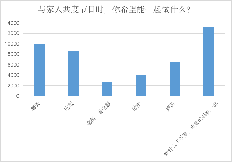 “和家人共度节日时,你希望能一起做什么?”在《劳动报》微信公众号《醒来》发布的调查问卷中,有这样一个问题。众多选项中,61%的受访者选择了“做什么不重要,重要的是在一起”。