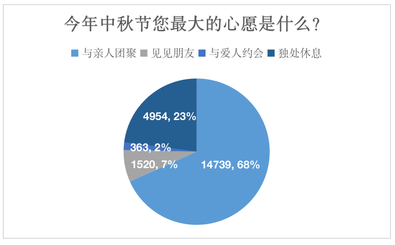 根据《醒来》发布的中秋调查问卷显示,在参与调查的21576人中,相比于与朋友(1520人)、爱人(363人)一起过节,有14739人今年中秋节最大的心愿是和亲人团聚,在所有投票人中占比68%。