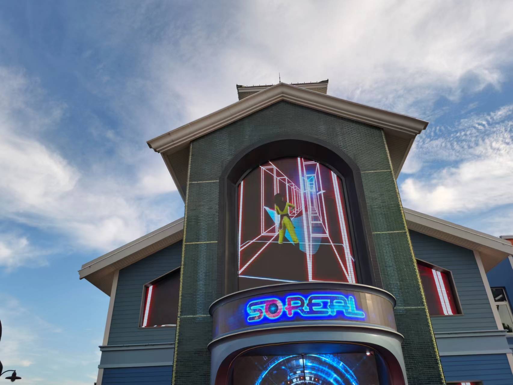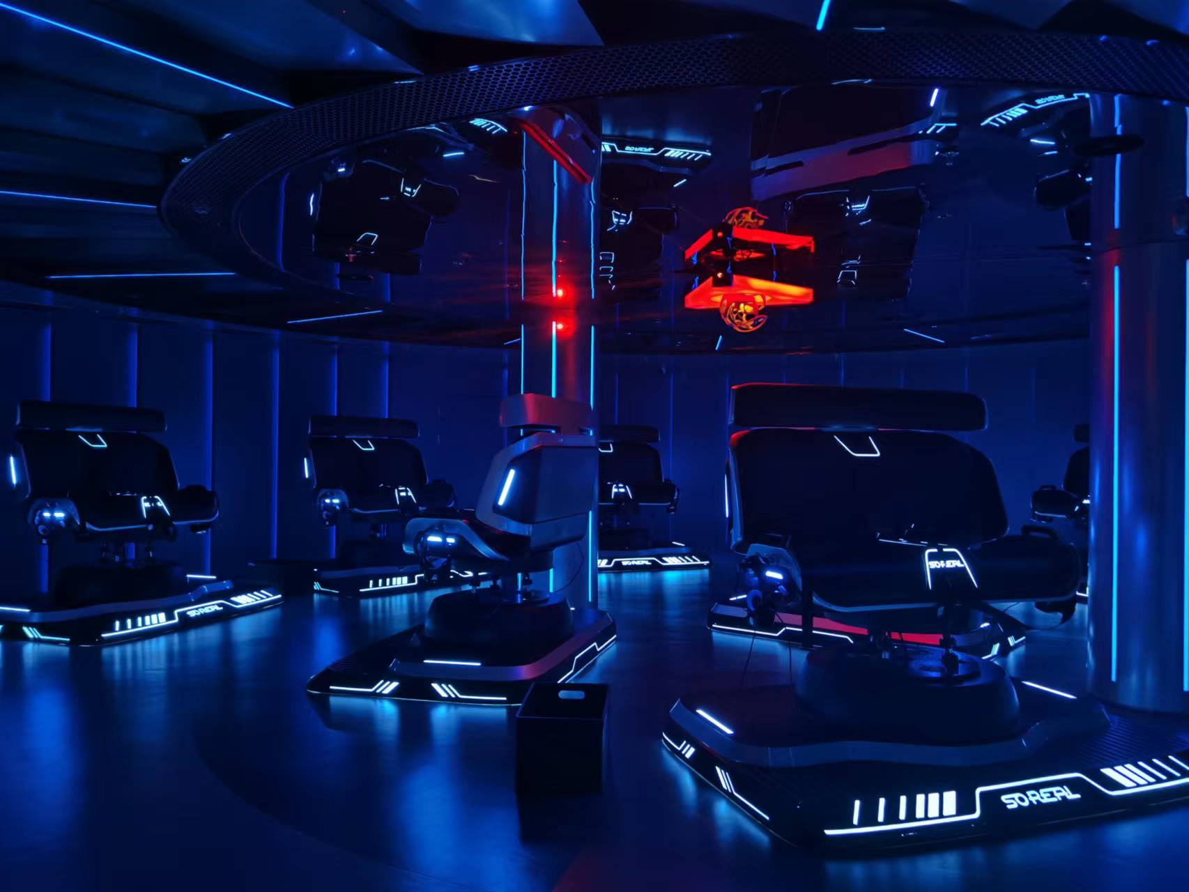 在两层高的VR场馆内,一楼主打多款不同类型的沉浸式体验项目,二楼则是SoReal为迪士尼小镇游客独家打造的全景行浸式光影体验。