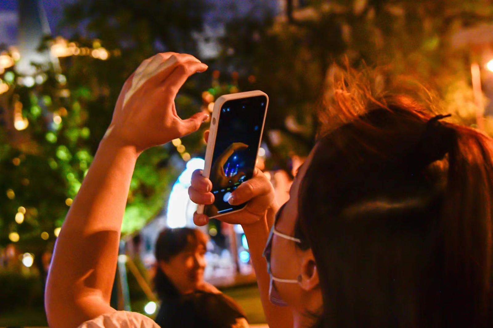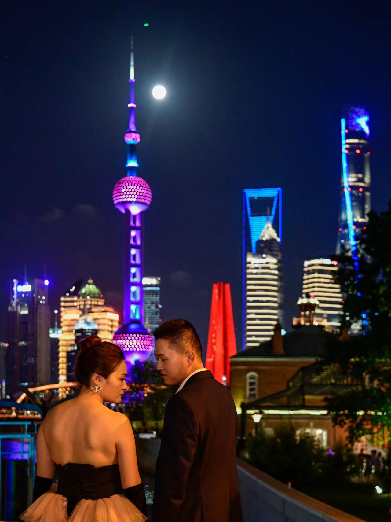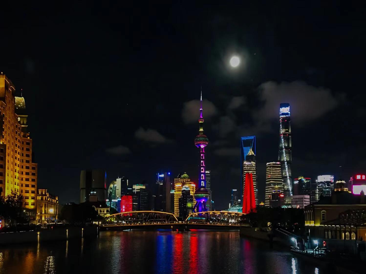 中秋佳节,上海黄浦江苏州河两岸月影绰约,不少市民沐浴着清朗的月光,欣赏绚烂夜景。