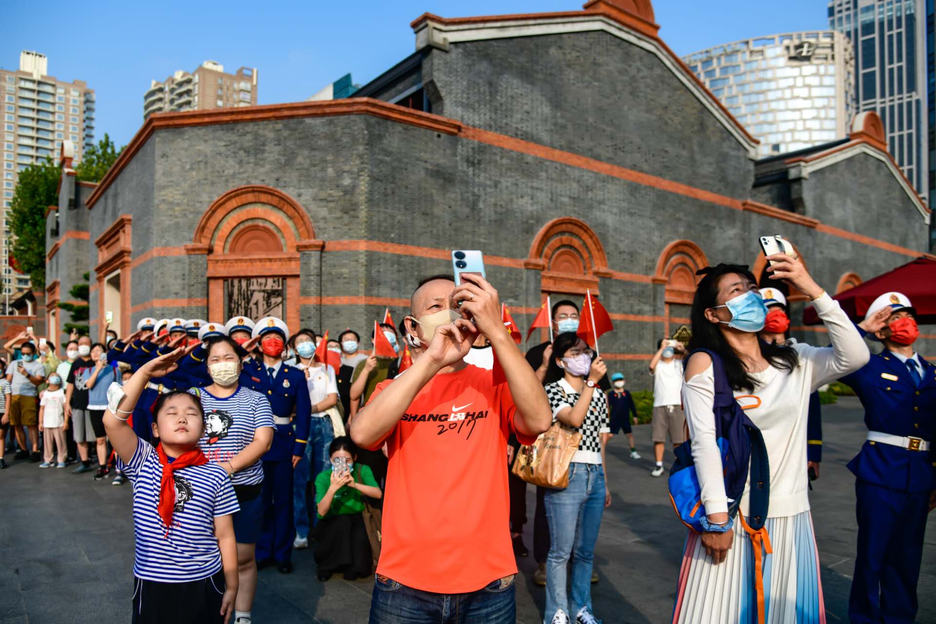 10月1日早上8点,五星红旗在中共一大纪念馆一大广场冉冉升起,不少市民特意前来观看升旗仪式。许多小朋友还带着红领巾,在升旗时向国旗行队礼。