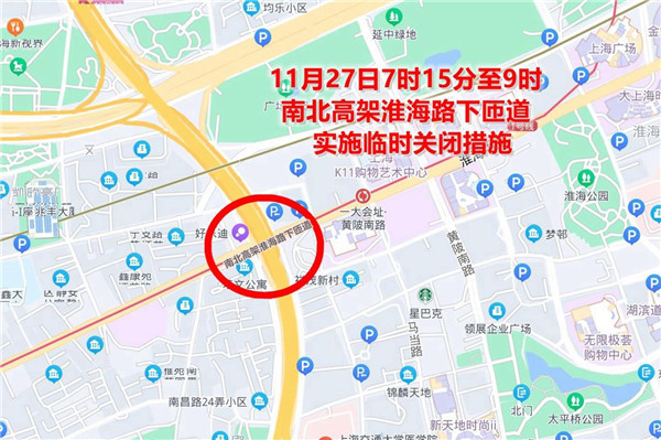 九、11月27日7时15分至9时,南北高架淮海路下匝道实施临时关闭措施。