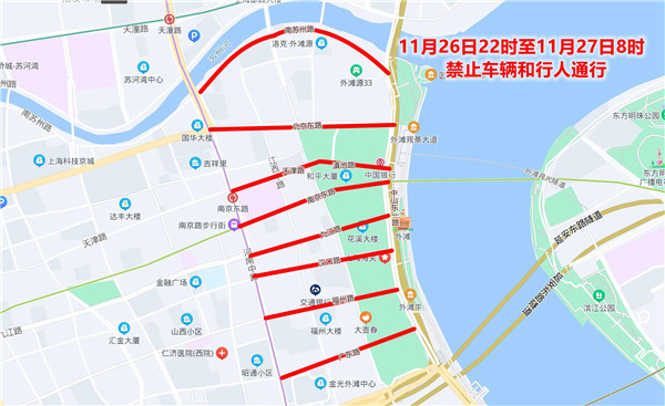 三、11月26日22时至11月27日8时,南苏州路双向(中山东一路—河南中路)、北京东路双向(中山东一路—河南中路)、滇池路双向(中山东一路—江西中路)、天津路(江西中路—河南中路)、南京东路(中山东一路—河南中路)、九江路(中山东一路—河南中路)、汉口路(中山东一路—河南中路)、广东路(中山东一路—河南中路)、福州路(中山东一路—河南中路)禁止车辆和行人通行。
