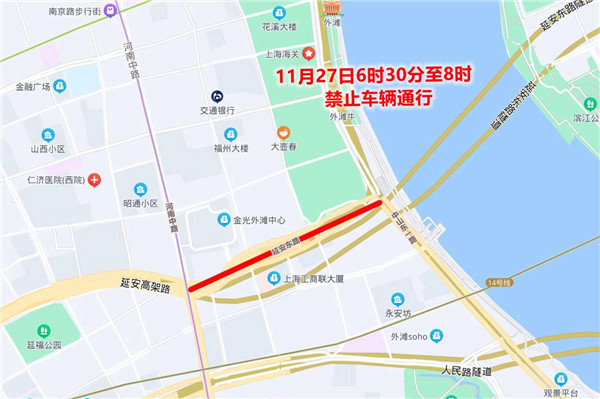 六、11月27日6时30分至8时,延安高架江西路下匝道(地面道路方向),延安东路双向(中山东一路—河南中路)禁止车辆通行。