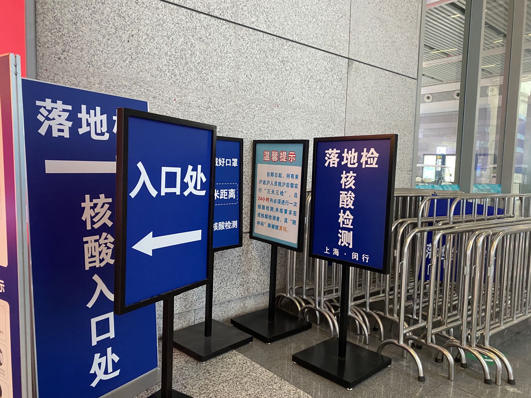 在上海虹桥火车站到达层,还未来得及运出车站的核酸查验物资和指示牌已经被暂时安放到了不影响通行的角落,部分尚未摘取的“扫码牌”被临时套上了各种纸袋遮挡。
