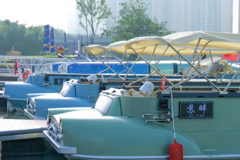 据介绍,综合考虑苏州河市区段航道窄、桥梁矮、急弯多、水位浅以及建造周期、运营效率、乘坐体验等因素,首批投入试运营的游船有10艘。船型选择上分为两种,如,“上海印象”系列小型游船复刻了上海牌轿车造型,搭配开放式敞篷设计,具备更好的通透性和亲水性,载客量11客位;而“时空之梭”系列中型游船装配全景式玻璃视窗、多媒体柔性透明屏和卫生间,载客量20客位。