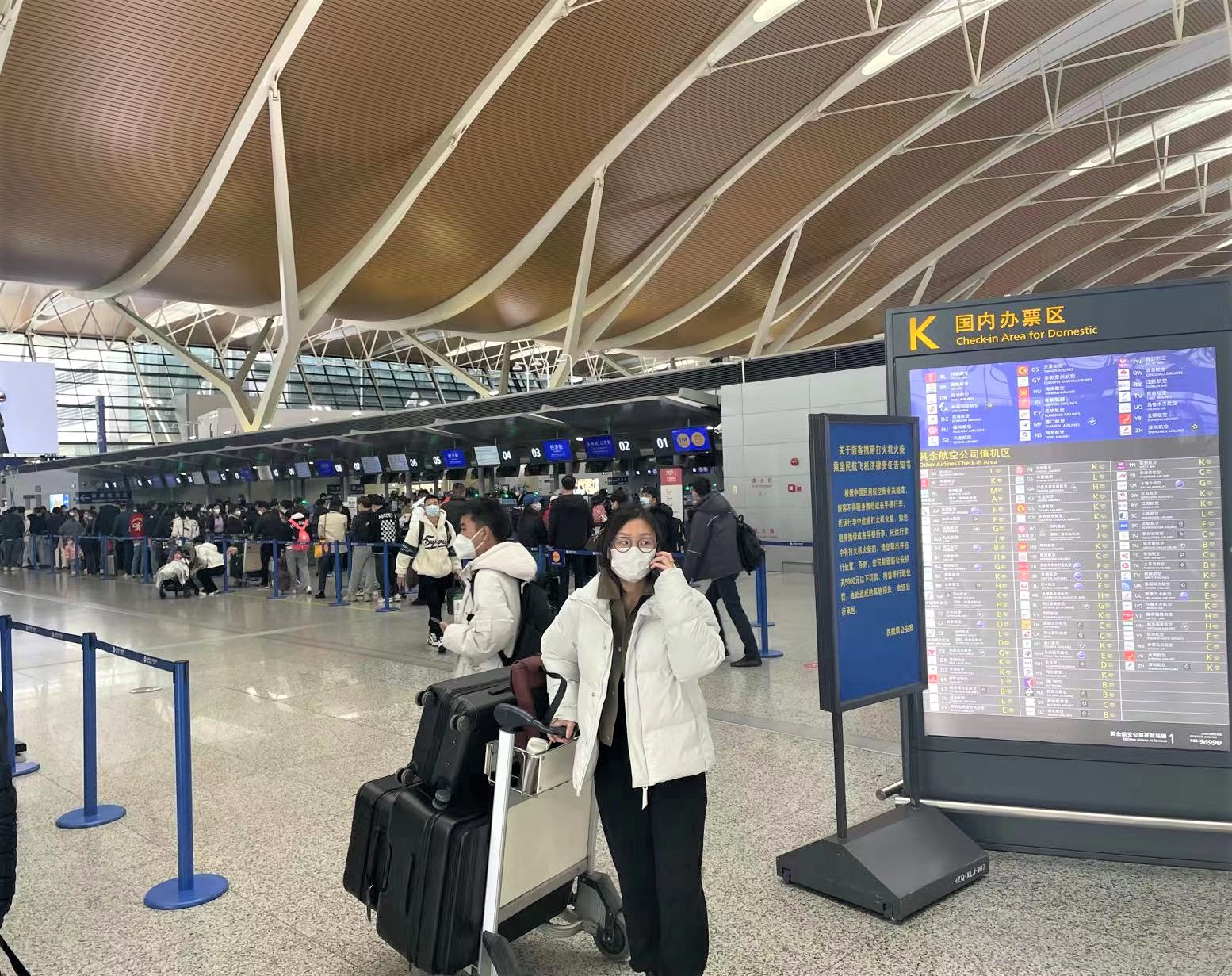 人群中,记者发现不少旅客都带着孩子一起外出。“趁着还没到春节,人不太多,赶紧带孩子回去看看老人。”刚打车来到浦东机场出发大厅的曾女士告诉记者,“过段时间就春节了,大家都好久没回去了,届时,票子难买,而且肯定贵。”