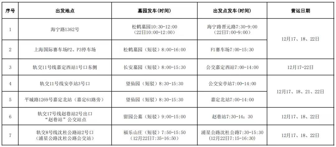 据巴士三公司相关负责人介绍,海宁路晋元路站点至松鹤墓区的班车时间为12月17、18、22日,F1赛场至松鹤墓区短驳车具体时间安排为12月10、11、17、18、22日,公司已于12月9日之前完成短驳车驾驶员组训工作,并制定了扫墓安全服务工作注意事项,要求全体行车人员必顺服从现场管理,按指定的线路、站点停靠上下客。