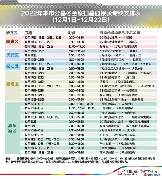 12月17日(周六)、18日(周日),地铁2号线、11号线执行扫墓专项运行图,调整运行交路,增加上线列车。祭扫高峰时段,两条线路运营间隔将较常态运营间隔有所缩短。