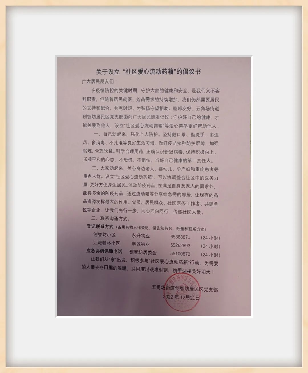 “这就是我的心里话。”陆建华如此说道,“正像倡议书说的那样,希望居民能自己动起来,当好自己健康的第一责任人;更希望大家动起来,在满足自身需求的基础上,将多余的防疫药品,通过流动药箱分享给急需的邻居,让现有的药品资源发挥最大作用。来关心身边的老人、婴儿、重症患者等重点人群。”