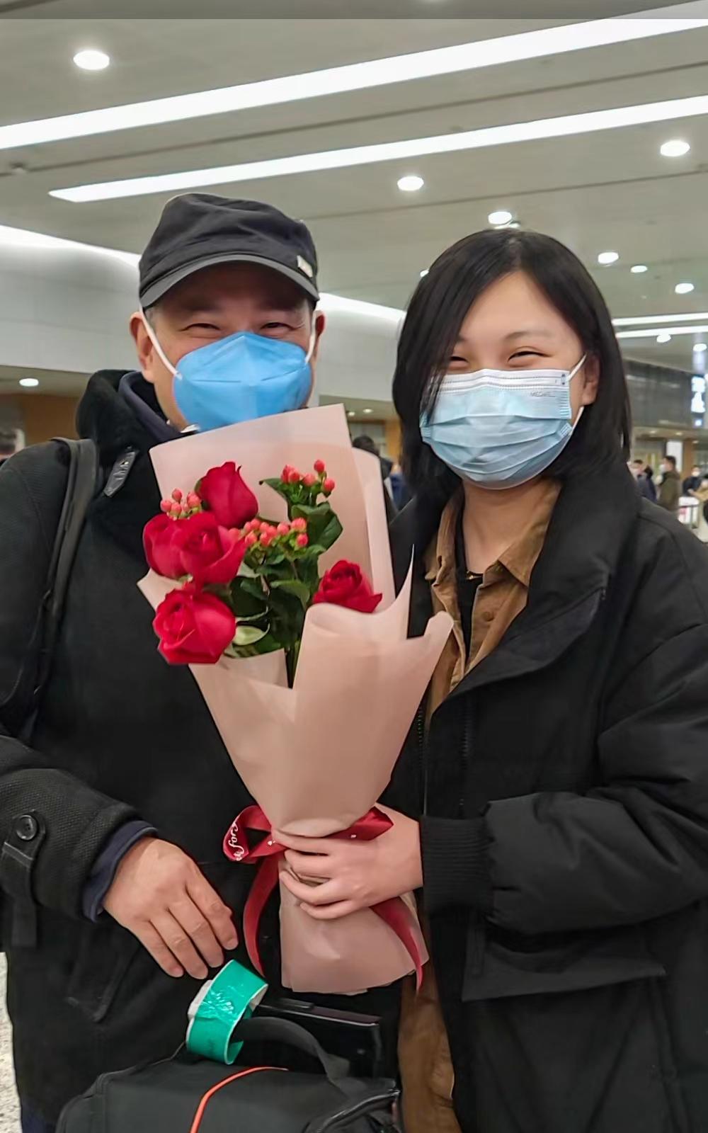 (汤先生特意带着自己配的花束来接机,准备给女儿惊喜。)