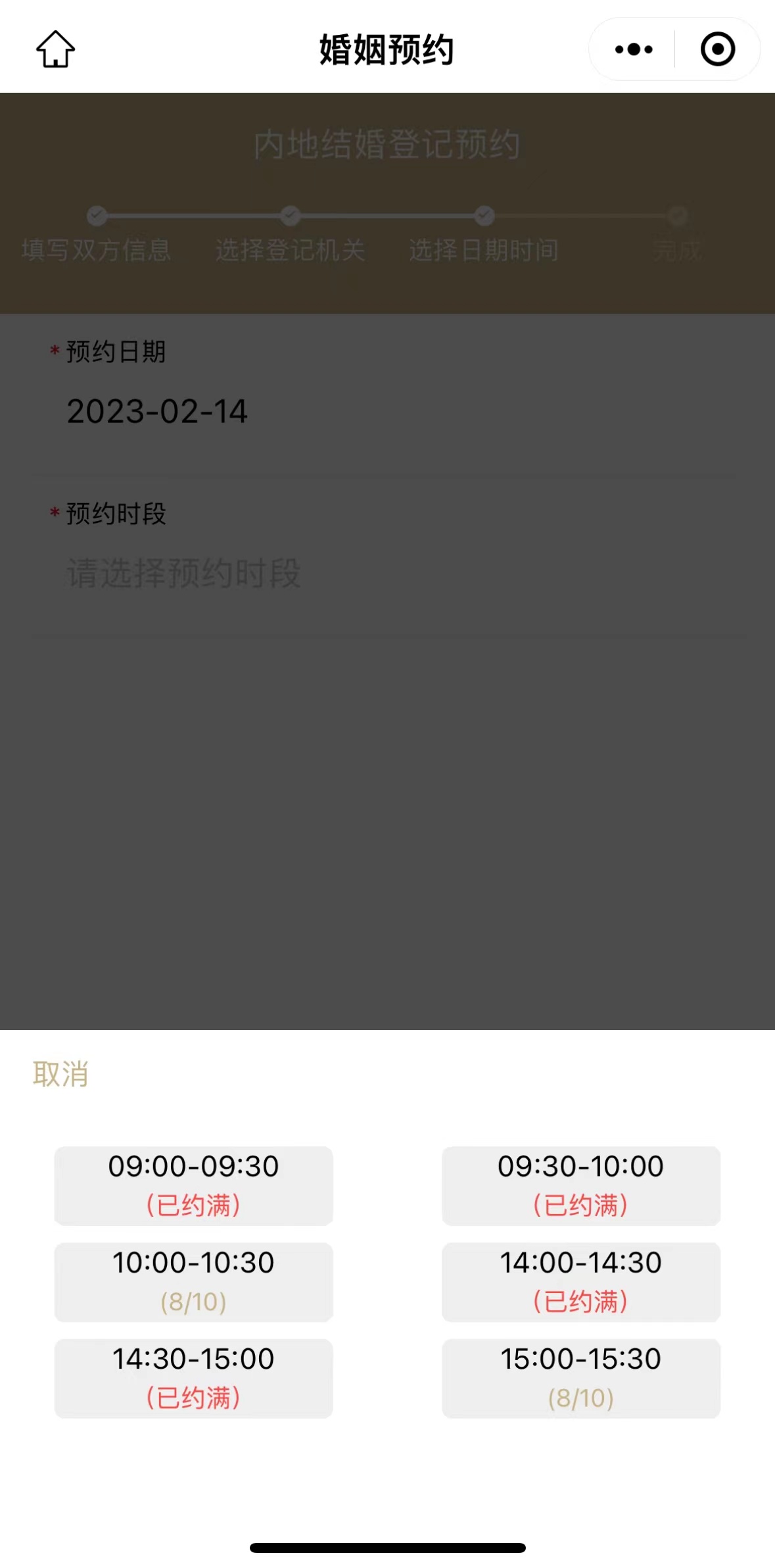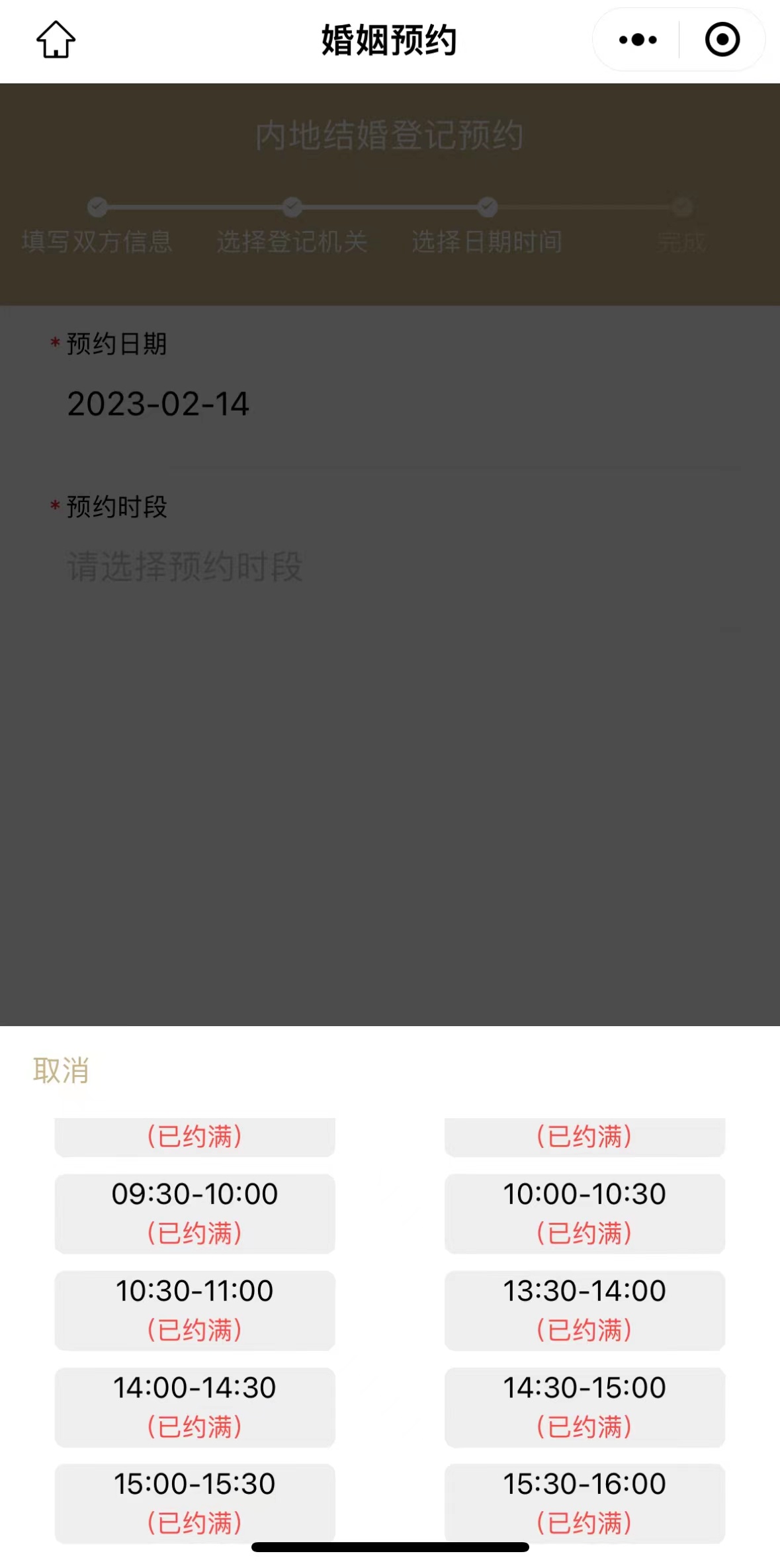 2月7日上午,记者通过“上海民政”微信公众号——“民服务”——“婚姻登记预约”进入,尝试预约2月14日的结婚登记,结果发现闵行、浦东、松江、黄浦、普陀、虹口、宝山、嘉定、金山、青浦、徐汇、奉贤、杨浦所有时段都显示“已约满”,仅崇明、长宁、静安还有少量余号。