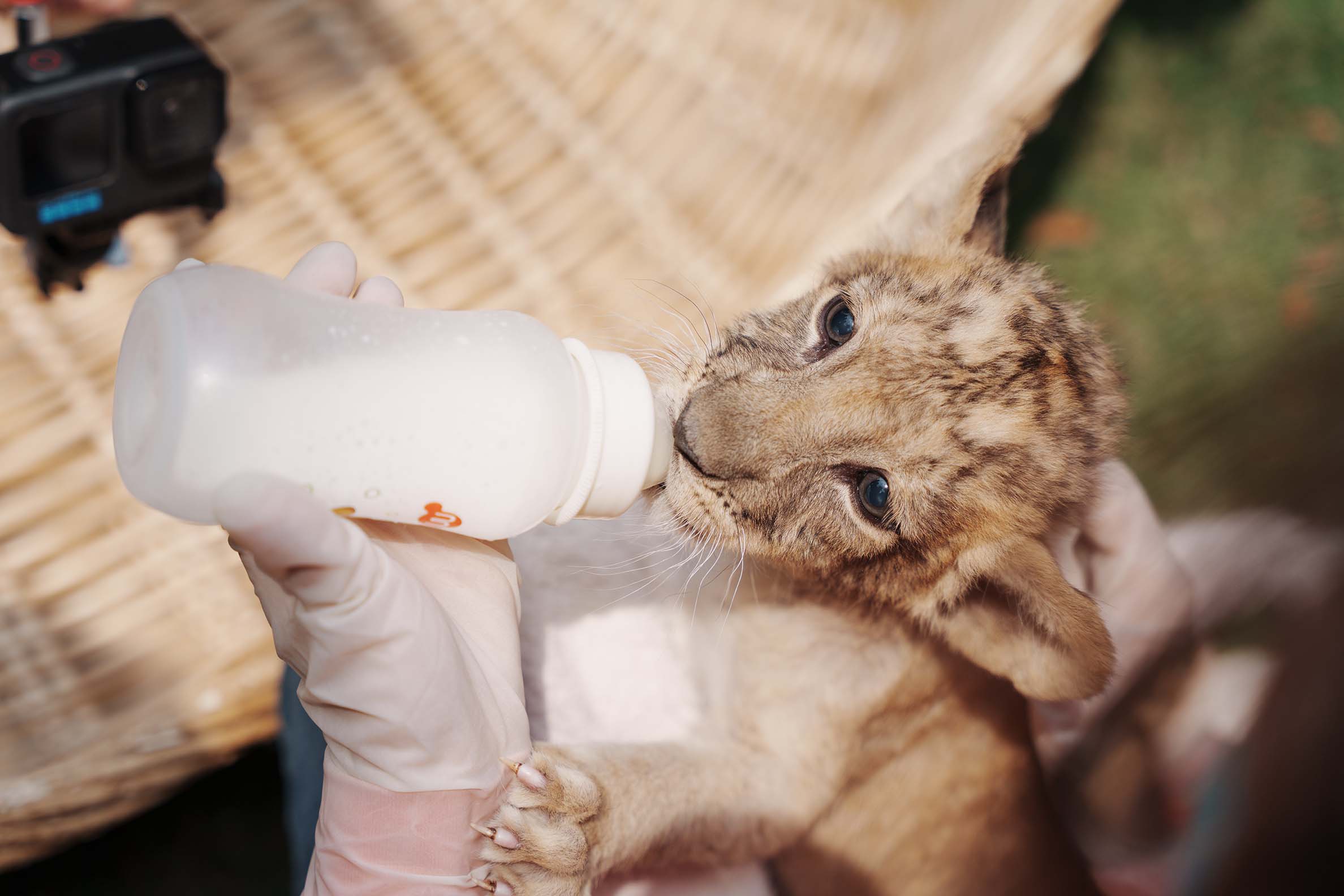 保育员在给非洲狮宝宝喂奶。劳动报记者 胡玉荣 摄影
