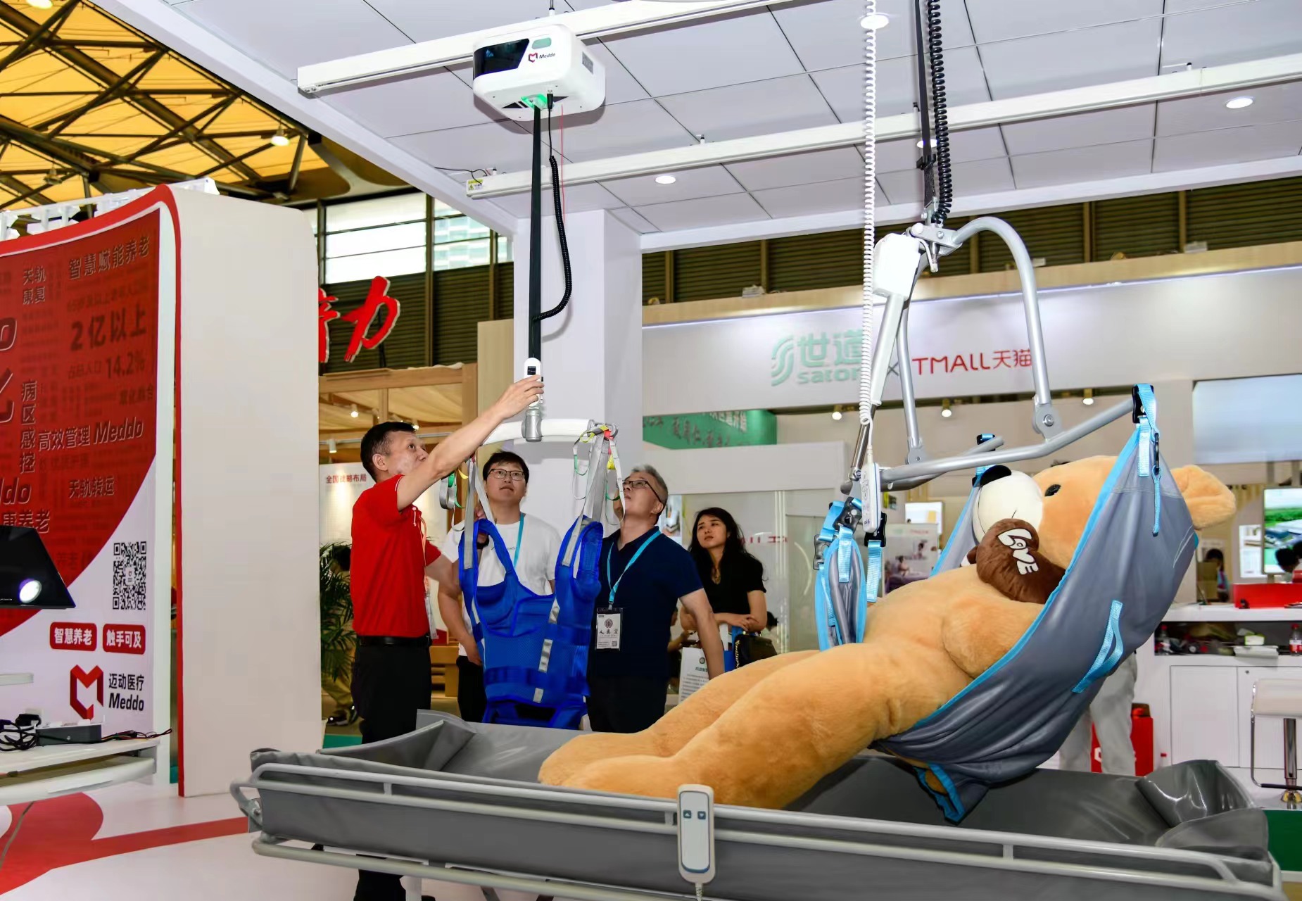 在老博会现场,记者在上海迈动医疗器械股份有限公司的展台看到一个躺在护理床上的等身大的玩具熊,公司产品部经理王诚正在以这只玩具熊为模特给观众演示如何移动床上病人的过程。