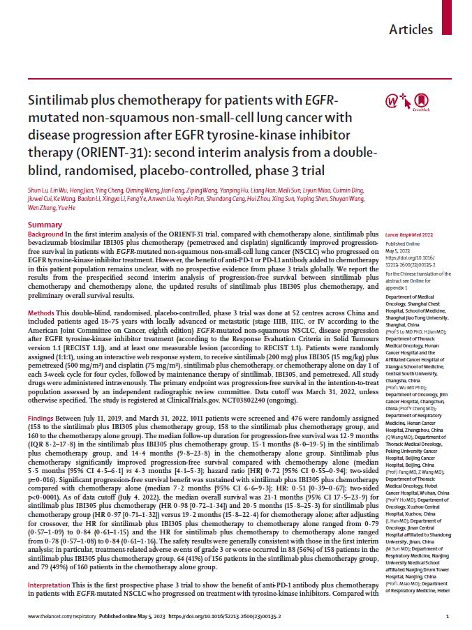 为了给患者探寻更多的治疗希望,胸科医院陆舜教授带领团队,聚焦以免疫治疗为基础的联合治疗模式,领衔开展了一项前瞻、随机、双盲、多中心III期临床研究“信迪利单抗联合贝伐单抗和含铂二药化疗对比含铂二药化疗治疗TKI耐药的EGFR突变晚期非鳞癌的随机双盲多中心临床研究”(即ORIENT-31研究),为EGFR靶向耐药后治疗开辟了新的格局。