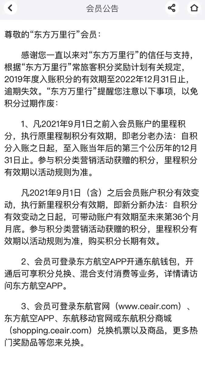 在“东方万里行”会员手册中也显示了账户积分有效期的相关规定:自2021年9月1日(含)起,有效里程积分变动可带动账户积分有效期自里程积分变动之日起至未来第36个月月底。连续36个月以上里程积分休眠(无增加,无减少),则自动失效。2021年9月1日前已入账的原消费积分仍按照原有效期及规则执行,即入账之日起,至入账当年后的第三个公历年的12月31日止有效。