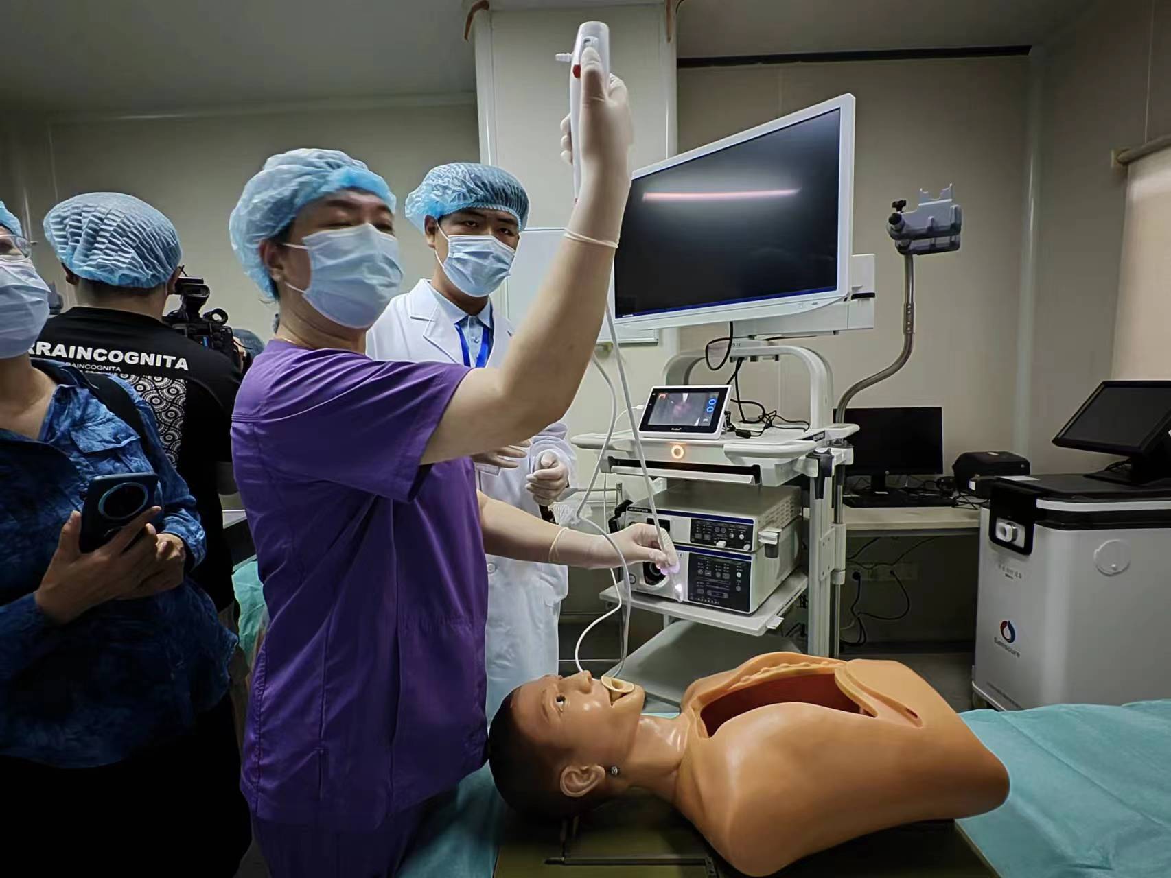 学生在护士长指导下体验气管镜插管检查。劳动报记者李蓓 摄影