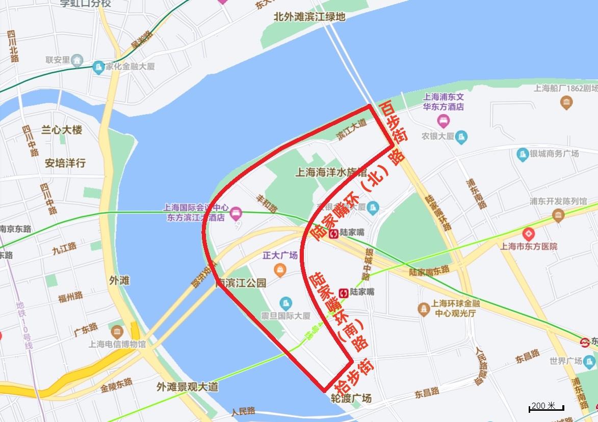 2.浦东地区:沿百步街—陆家嘴环(北)路—陆家嘴环(南)路—拾步街及黄浦江边所围合区域内的道路(不含上述道路),禁止机动车通行。