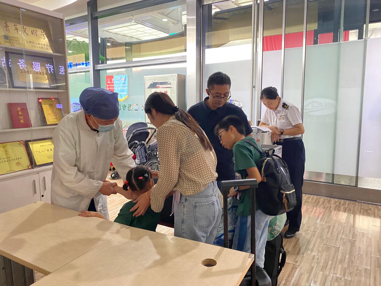 走入“心尚”雷锋服务站,已经有很多“老弱病残孕”重点旅客坐在这里休息。环顾服务站,母婴室中,几位妈妈正在照顾孩子;虹桥爱心医疗服务点的医生给一位右臂脱臼的小女孩接好胳膊,又仔细叮嘱家长注意事项;时而还有志愿者推着乘坐轮椅的旅客进来休息。刚刚工作人员送一班车的两位重点旅客去站台的时候,手上推着一位坐着轮椅的骨折旅客,肩上搭着一位视障旅客的手。