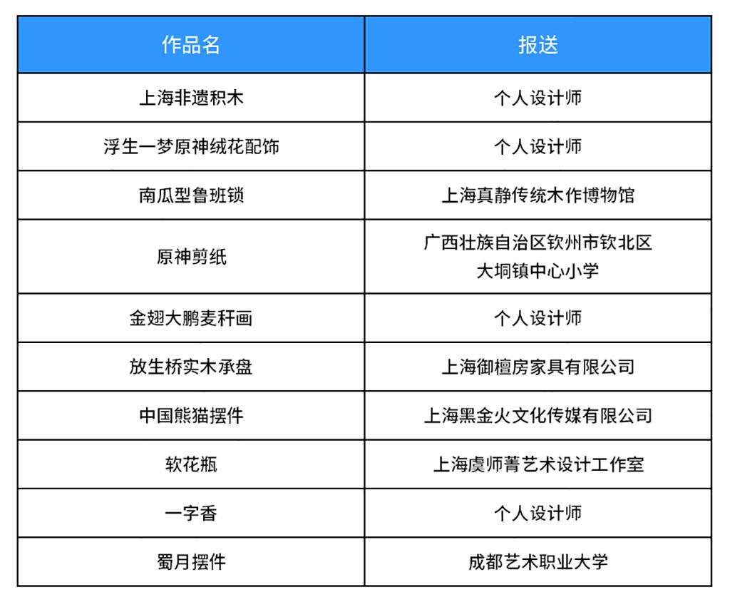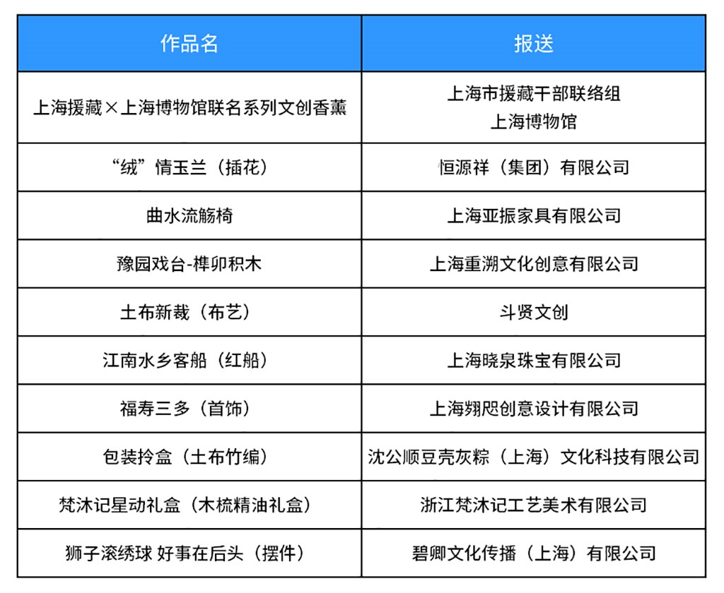 记者见到,获奖作品中,既有“上海援藏×上海博物馆”联名系列文创香薰、“绒”情玉兰(插花)、曲水流觞椅等传统作品,也有上海非遗积木、南瓜型鲁班锁、原神剪纸等融合现代潮流文化元素的作品。