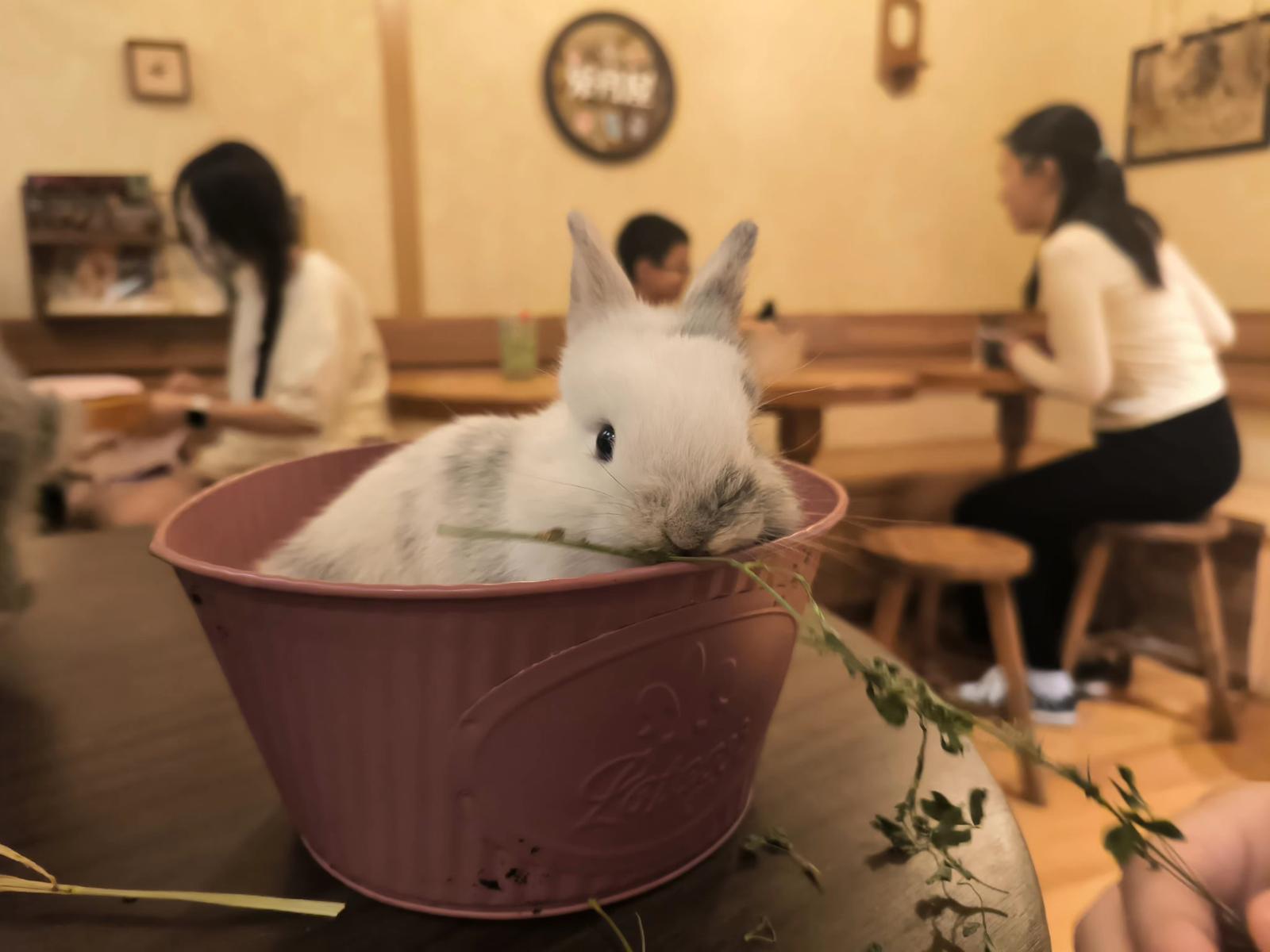 “这只吃饱了,草都不想吃了。”“那只是双血侏儒吧,长得太好看了!”他们手捧盆子,精心挑选着未来几小时的陪伴者。挑好以后,顾客们会用盆子小心翼翼地把兔子带到餐桌上。然后,再点上一杯咖啡,一边和朋友聊天,一边开启快乐地撸兔时光。不少人还会给兔子点上一份干草,体验一把喂兔的快乐。
