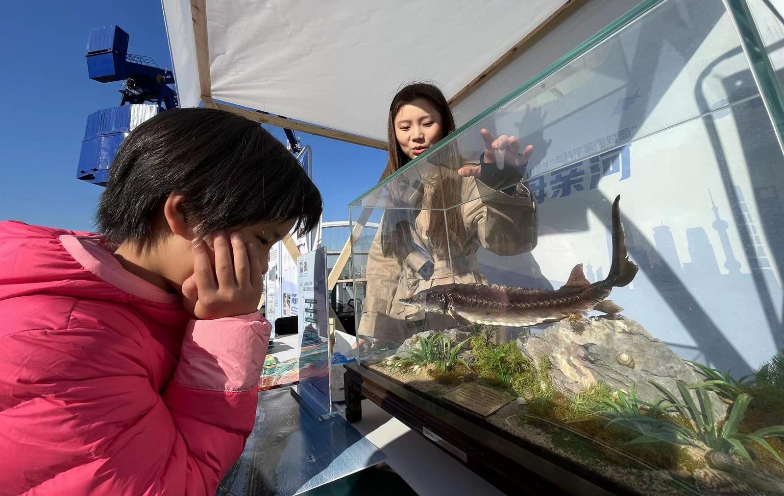 本次游园会的重头戏当属“守护母亲河”科学集市。现场共设置了来自中国水产科学研究院东海水产研究所、上海市水生野生动植物保护研究中心、上海市环境科学研究院、上海铁路检察院、中国科学院上海微系统与信息技术研究所、华东师范大学等10个科学展位,分别从“长江水生生物多样性”“长江旗舰物种保护”“水生态修复”“水生入侵物种防治”“以法护河”等多个维度展示了长江水生态环境保护及相关重要科研、实践成果。