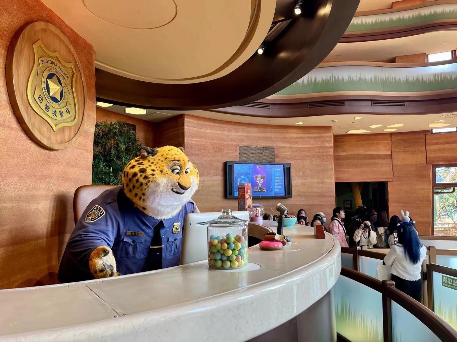 “疯狂动物城:热力追踪”等候区有电影中的豹警官。劳动报记者贡俊祺 摄影