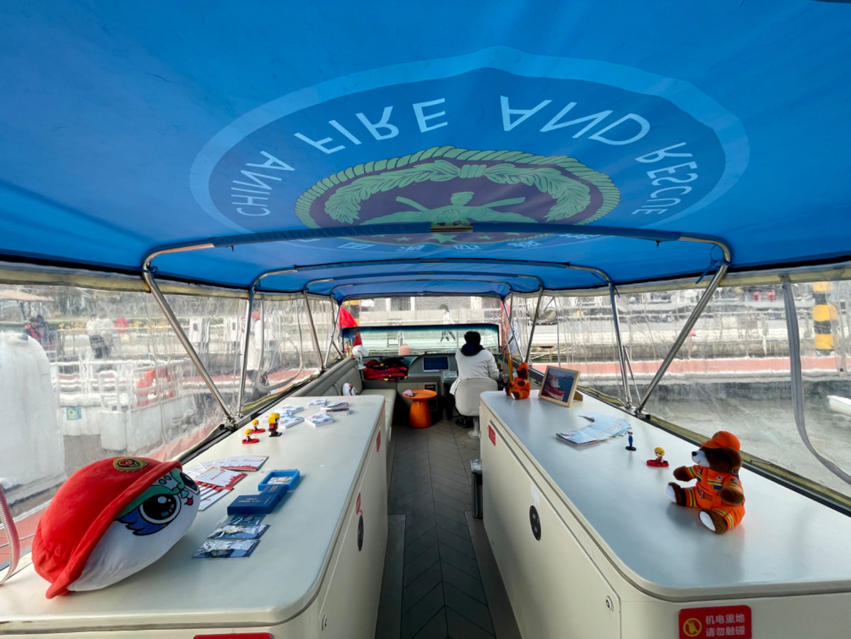 游览船两侧印有“中国消防救援队队旗”,船身写着“预防为主,生命至上”八个大字,彰显了鲜明的消防主题特色。船舱内还配备了各种来自消防的文创小礼物,从钥匙扣到抱枕,再到原创漫画书,无处不体现着消防元素。