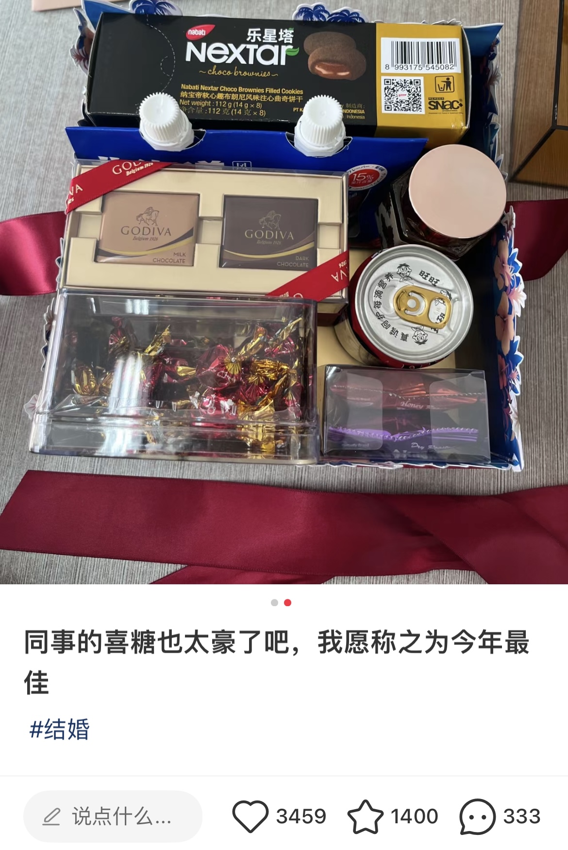 网友在社交媒体上分享同事送的豪华喜糖。网络截图