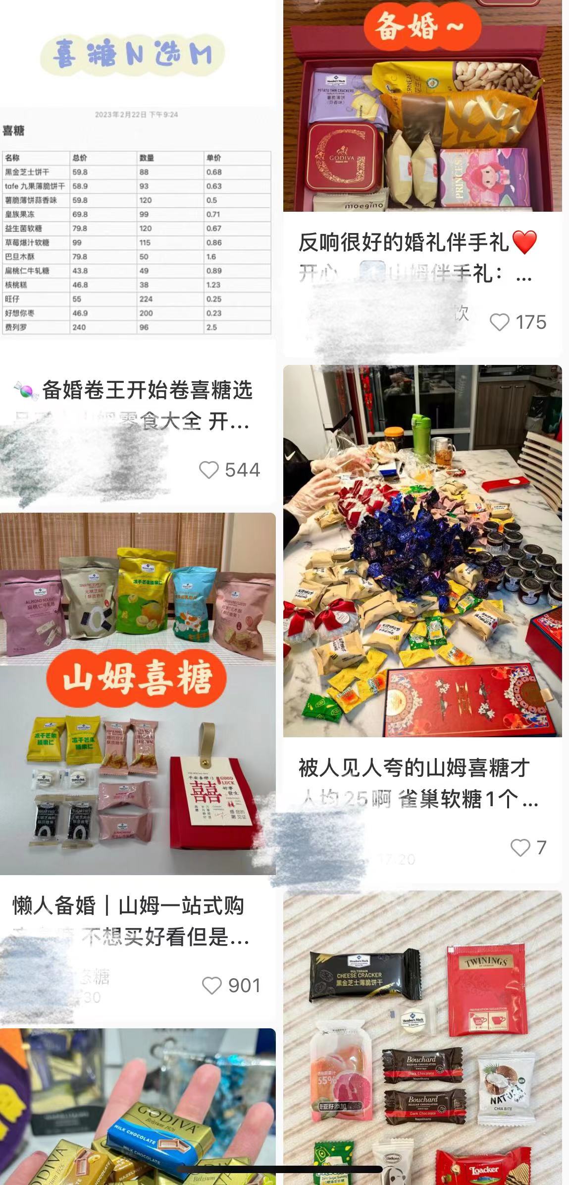 “我在网上‘抄作业’,跟着大家的单子采购。”网友“我是小马甲”在山姆超市购买了巧克力、益生菌糖、巧克力饼干、软心蛋糕、坚果等,另外在阿里巴巴网站上批发了喜糖盒子。“喜糖一共花了5.8元,盒子2元一个,不到8块钱。送给同事们,大家都喜欢吃,说是最近收到的最好吃的喜糖。当时我心里也美滋滋的。”