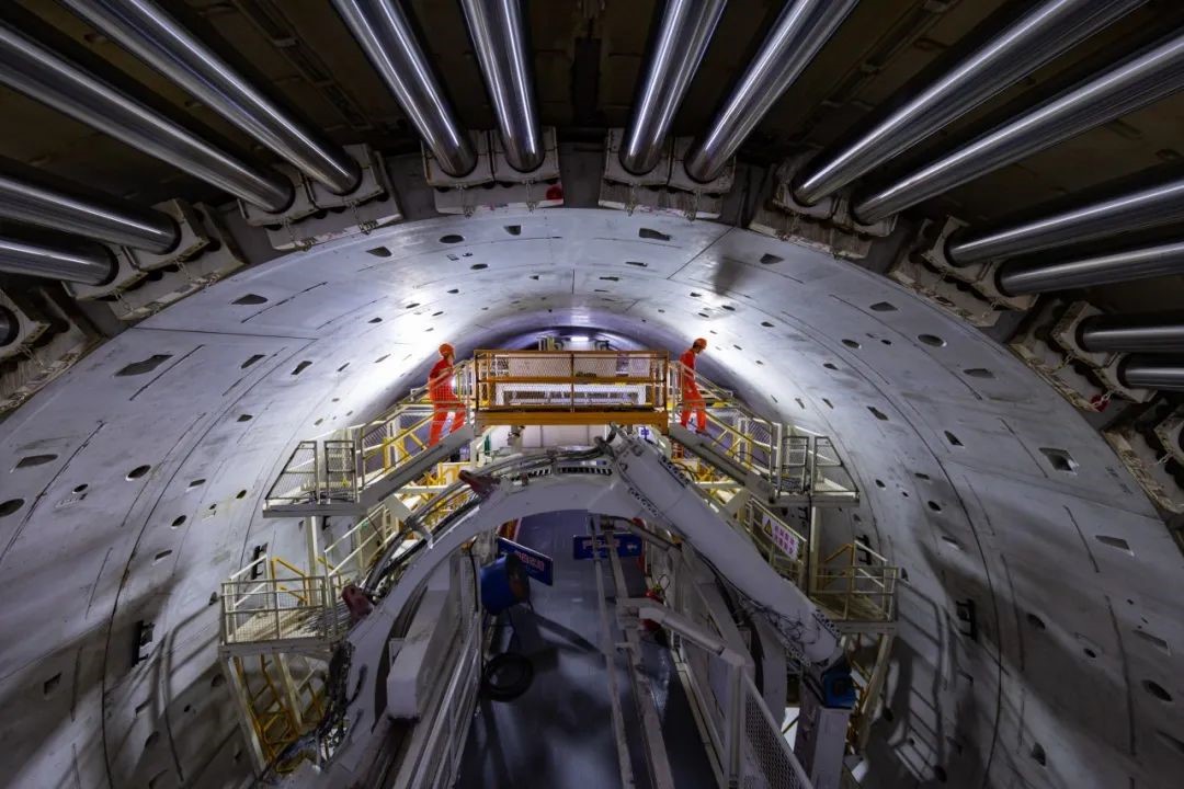 记者在拼装完成的越江区间隧道中可以看到,整齐的隧道管片环环相接,不断延伸,各类施工车辆来回穿梭,隧道前端的管片拼装机在施工人员操作下,精准地将一块块管片拼装成环并向前推进。据悉,在推进过程中,上海地铁组织各参建单位依托科学管理,运用数智赋能,确保了工程建设安全稳步推进。