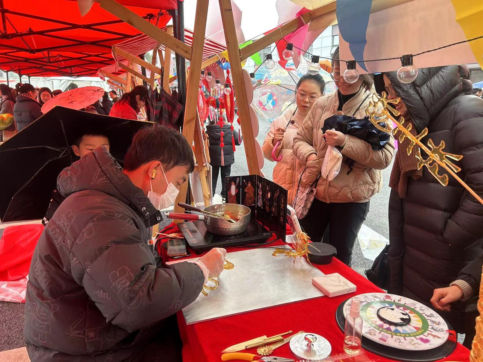 城门一开,市集开市。在百姓大舞台旁,集合了围炉煮茶、传统点心、年宵花卉、古法酿酒、糖画面人、年味小吃、非遗教室、儿时游戏、社团风采等30多个摊位,不仅年味十足,更给村民们带来吃喝玩乐“一站式”体验。