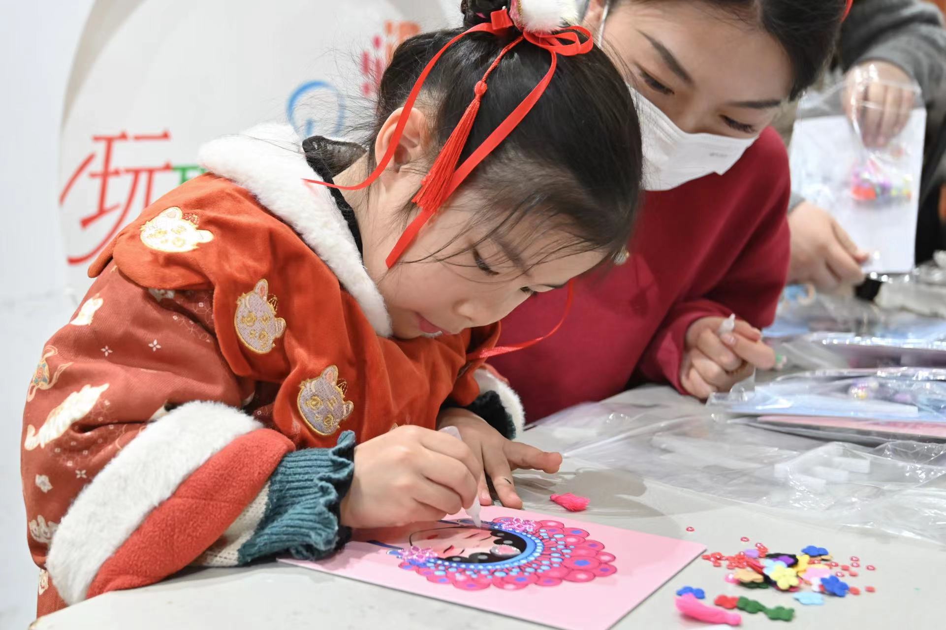 活动现场,在老师和志愿者的指导下,爱心寒托班孩子们动手制作脸谱,运用颜料给京剧脸谱上色,体验脸谱非遗的国风国韵。他们体验非遗鱼龙灯制作,感受中华非遗文化魅力。他们还亲手写对联、写福字,将其悬挂在洋溢着浓厚新春氛围的心愿打卡区。通过参与迎新春游园剪纸、贴窗花、捏彩泥、拓印龙板画、3D糖画等民俗游戏,孩子们深入感受中华传统文化的博大精深,进而增强对民族传统的认知和情感共鸣。