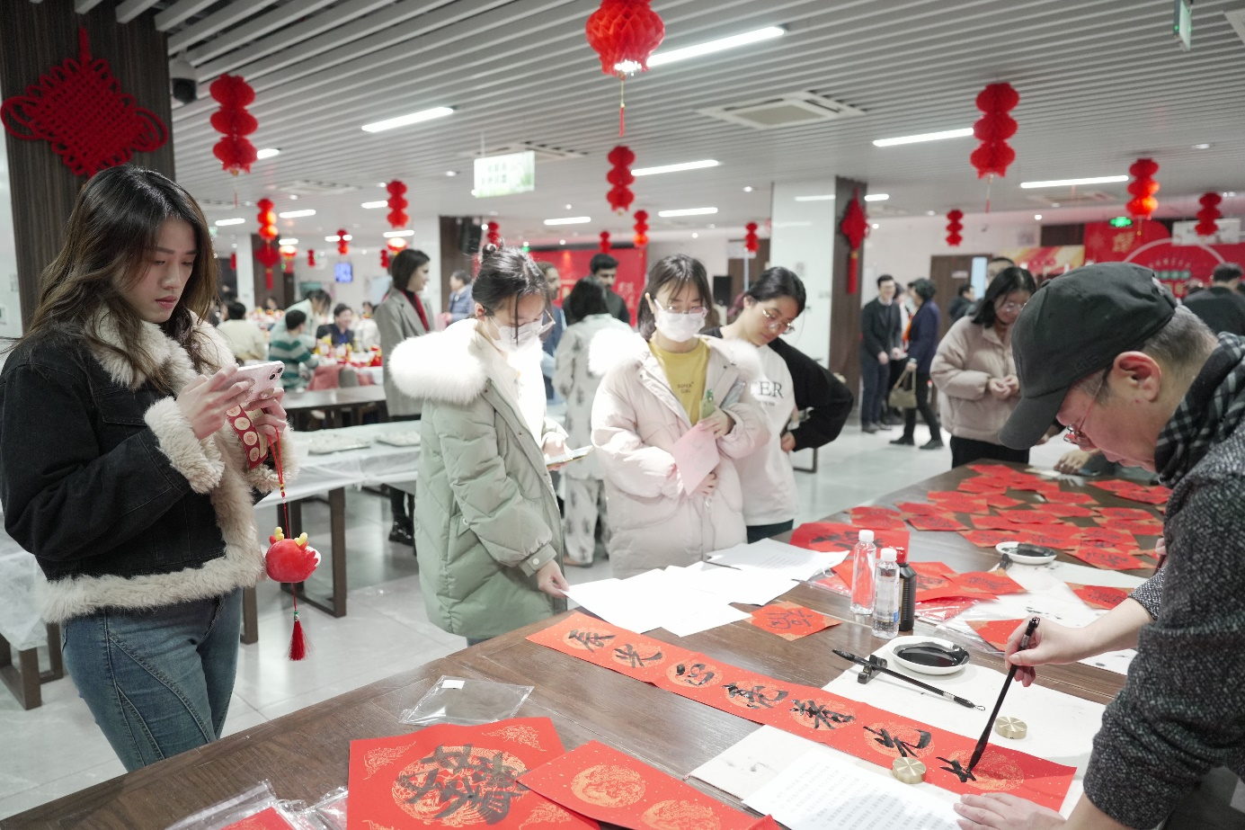 在“迎春年夜饭”活动开始前,学校还设置了“迎春游园会”环节,一起探寻中国传统年俗,弘扬中华优秀传统文化。迎春年夜饭活动也吸引了学生们热情参与筹备,来自信息科学与工程学院研究生陈加昊同,带队的华东理工大学机甲大师起源战队研发的“Long”机器人为师生带来了Robot送“福”表演,他们希望用自己专业技术研发的机器人,活跃年夜饭活动的气氛,增添喜庆的元素。