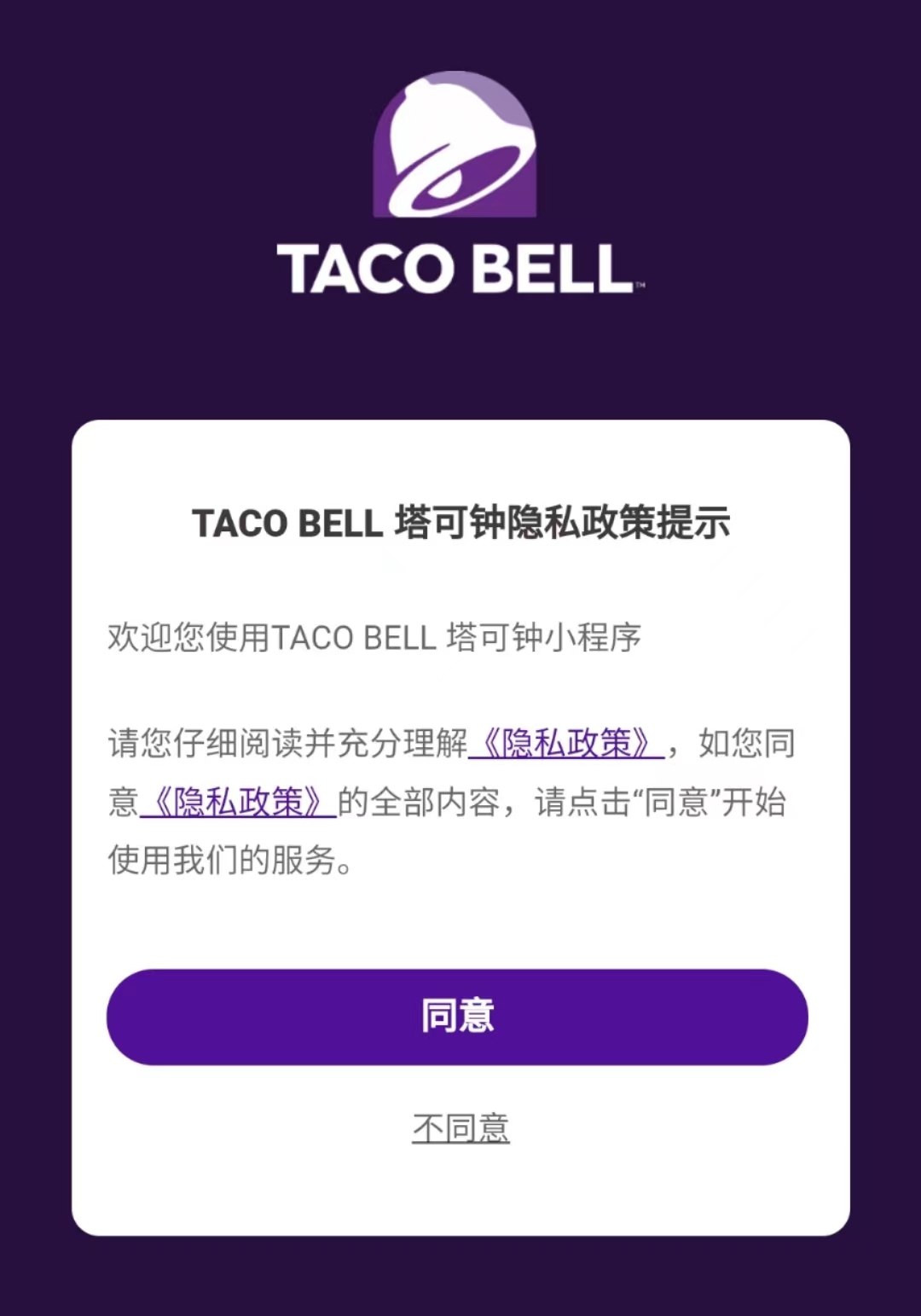 若选择不同意《隐私政策》,该小程序会自动退出。图源:塔可钟小程序