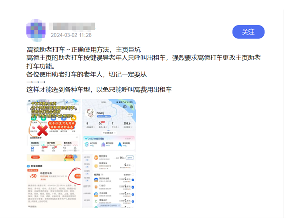 老张的“优惠券乌龙”并非个例。有网友于今年3月初表示,助老打车界面“有坑”,不能选车型,只可呼叫价格比较贵的出租车。这名网友发现,其实这种优惠券也可以用在网约车上,从“钱包卡券”渠道进入并使用券,就能将优惠应用到网约车上。该网友呼吁高德打车更改助老打车界面主页。