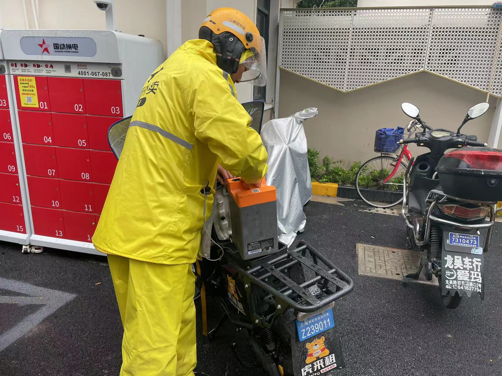 头图为外卖小哥正在使用换电柜为电动自行车更换电瓶。劳动报记者 包璐影 摄影